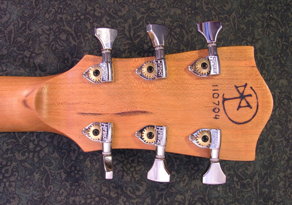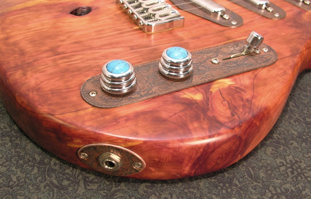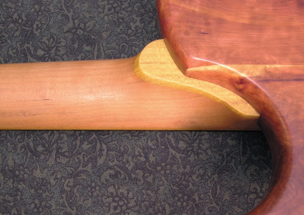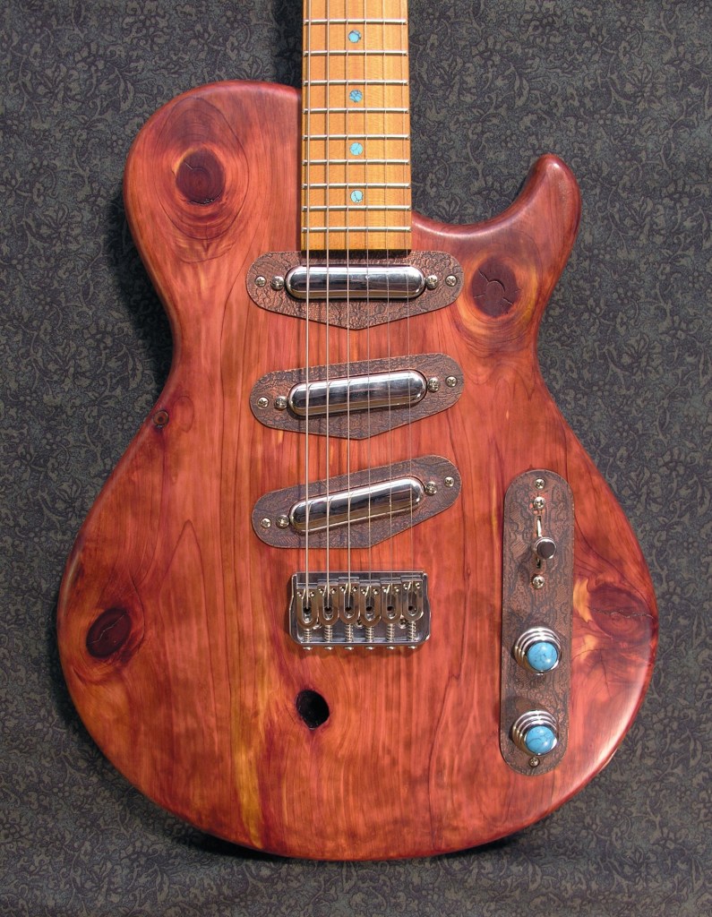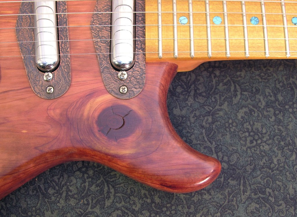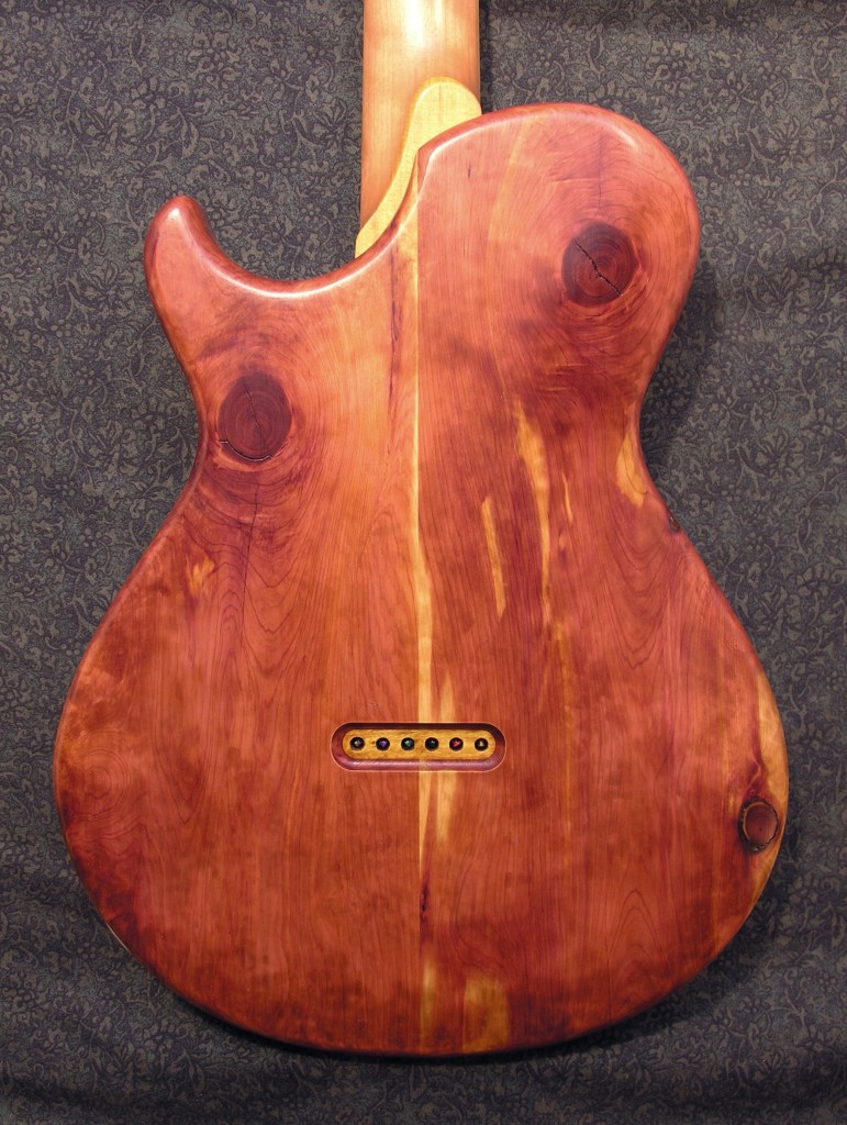 Cherry set neck with Osage orange fretboard and eastern red cedar headstock overlay.