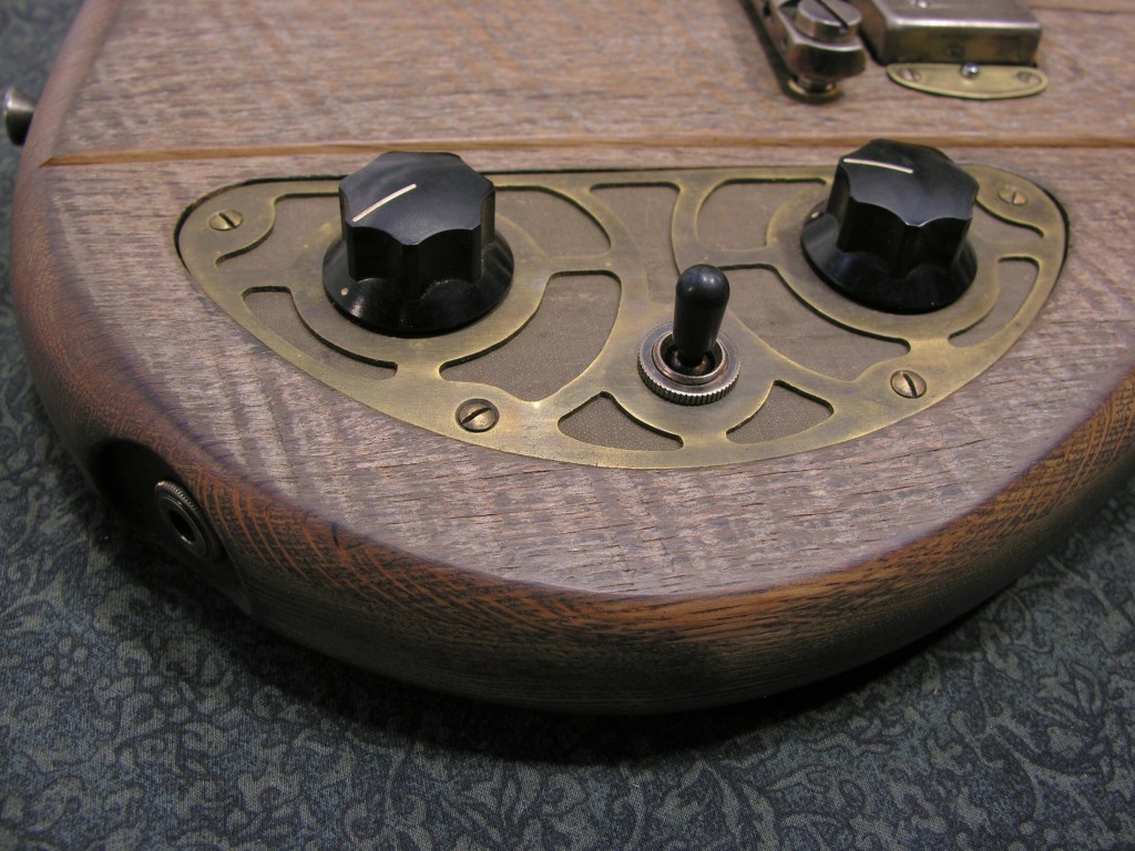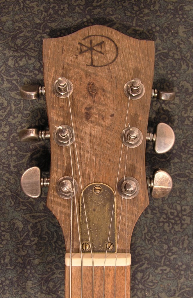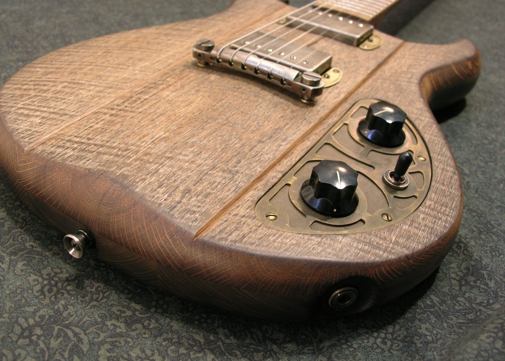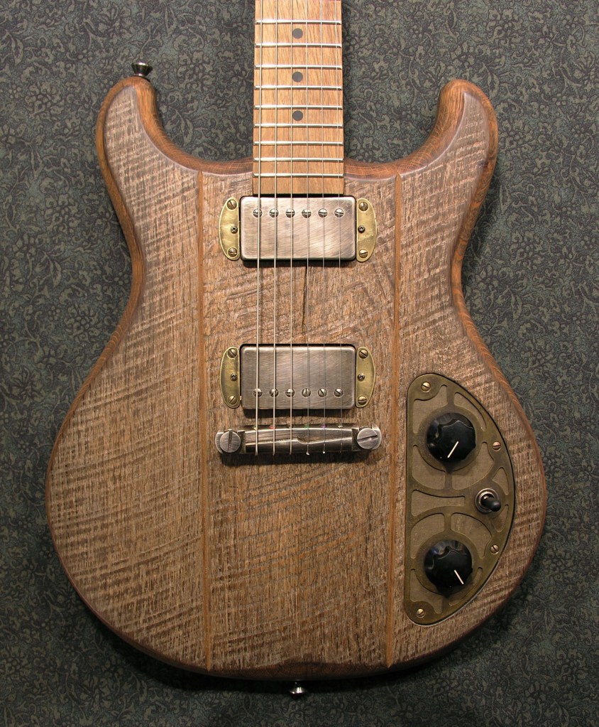 Three piece sassafras body, chambered, with three piece arched white oak barnwood top.