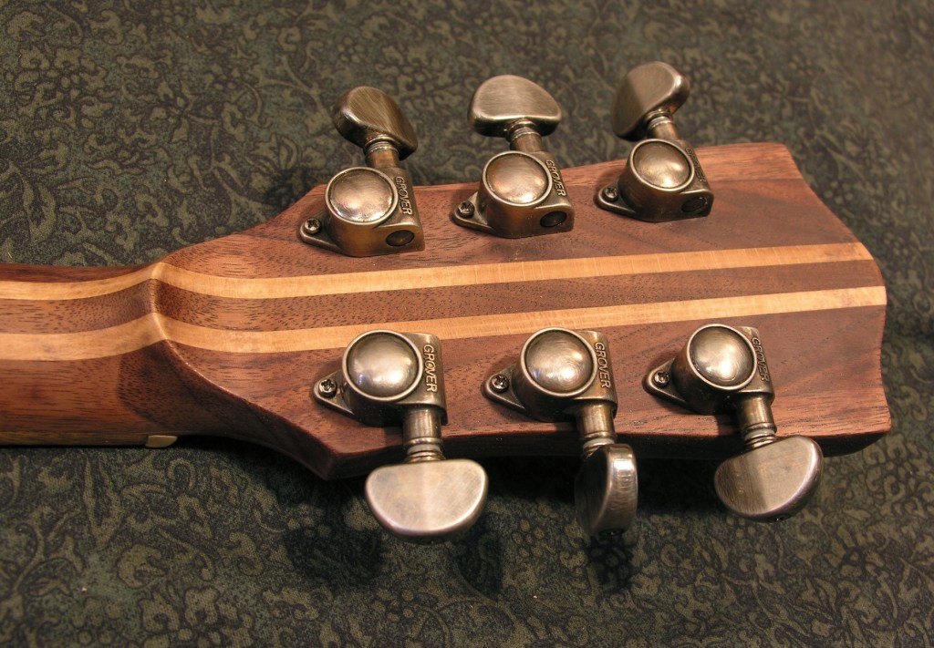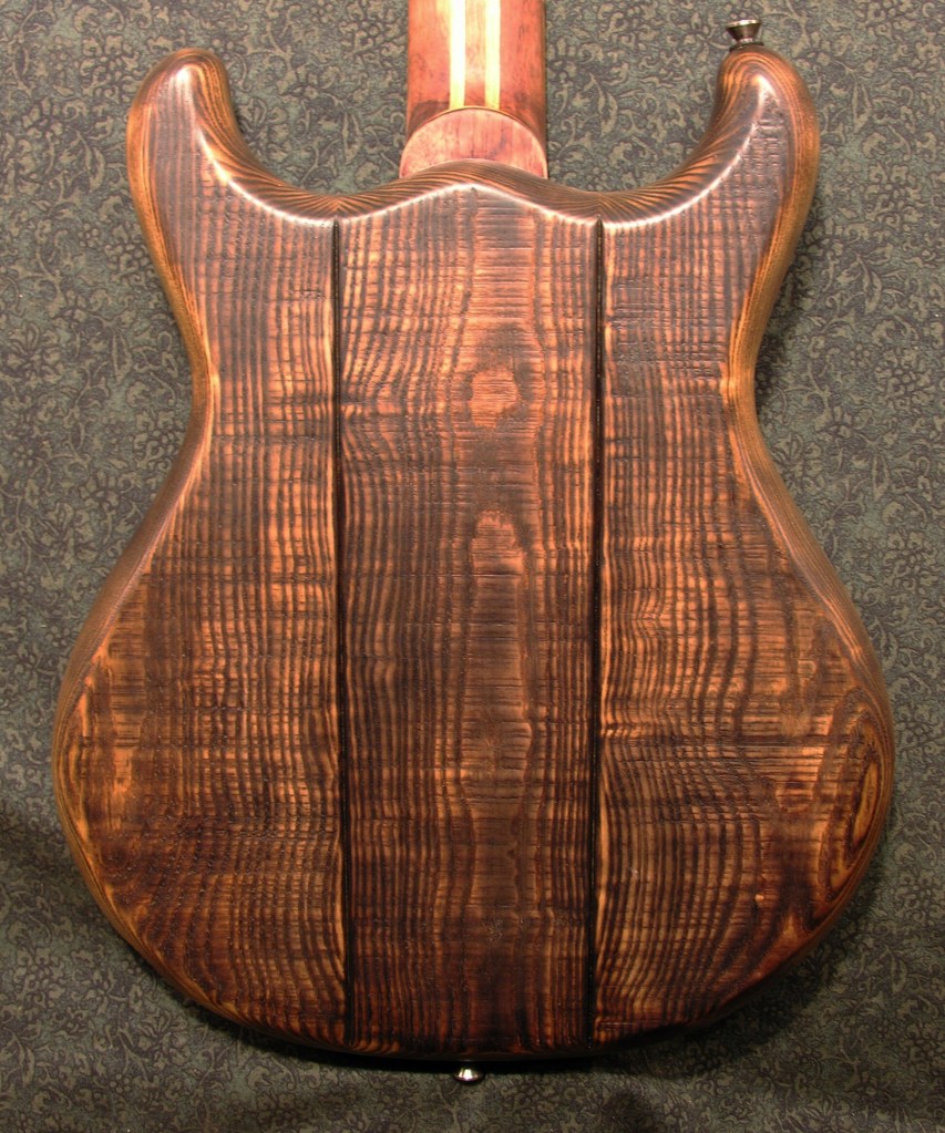 Walnut and beech laminated set neck with persimmon fretboard and oak barnwood headstock overlay.
