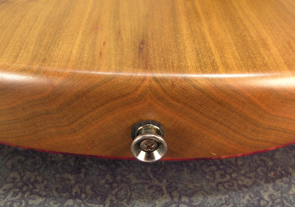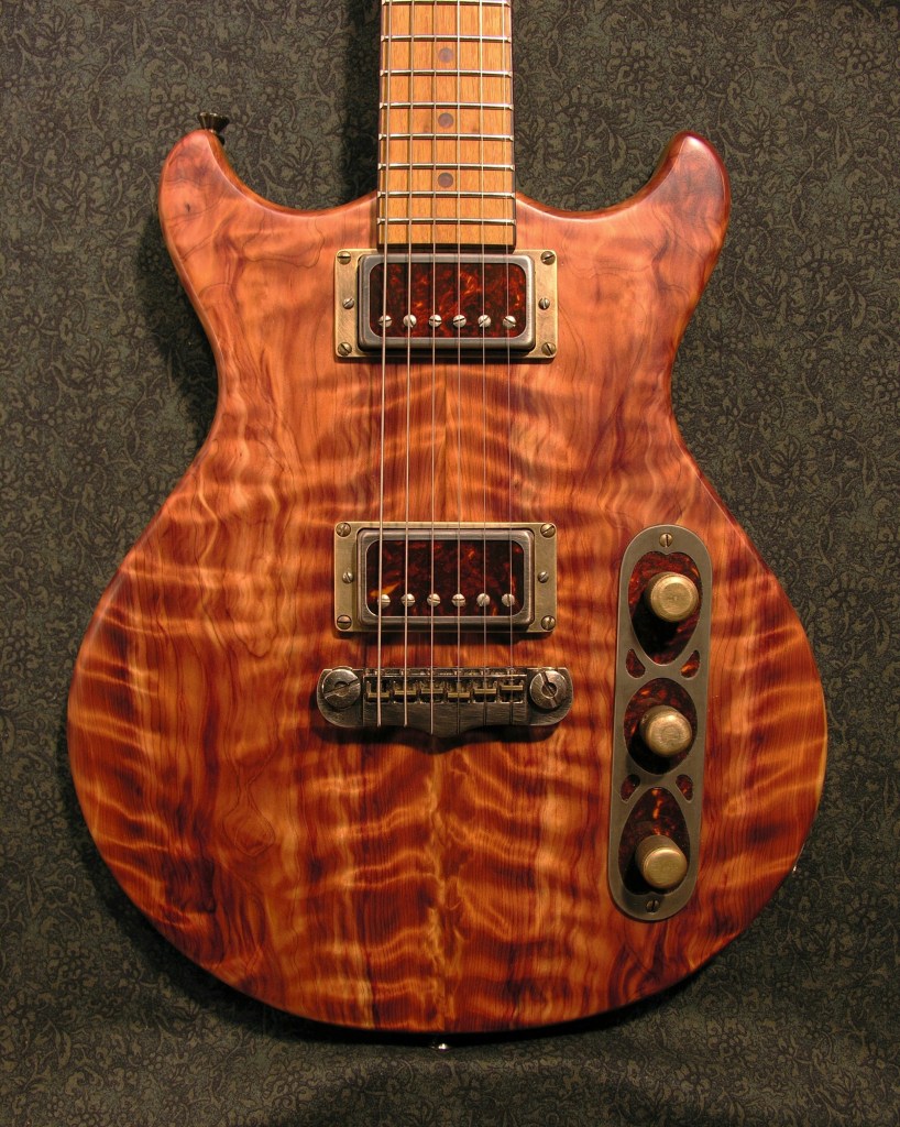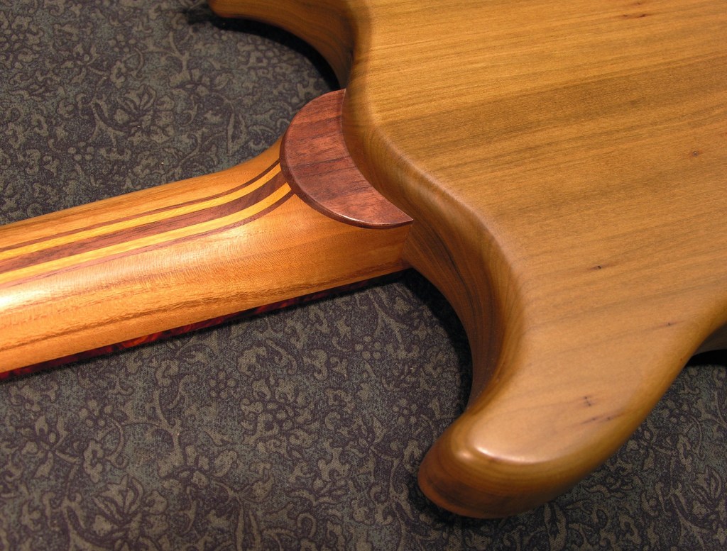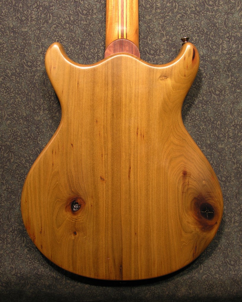 Red mulberry, Osage orange, and walnut laminated set neck with Osage orange fretboard and curly eastern red cedar headstock overlay.