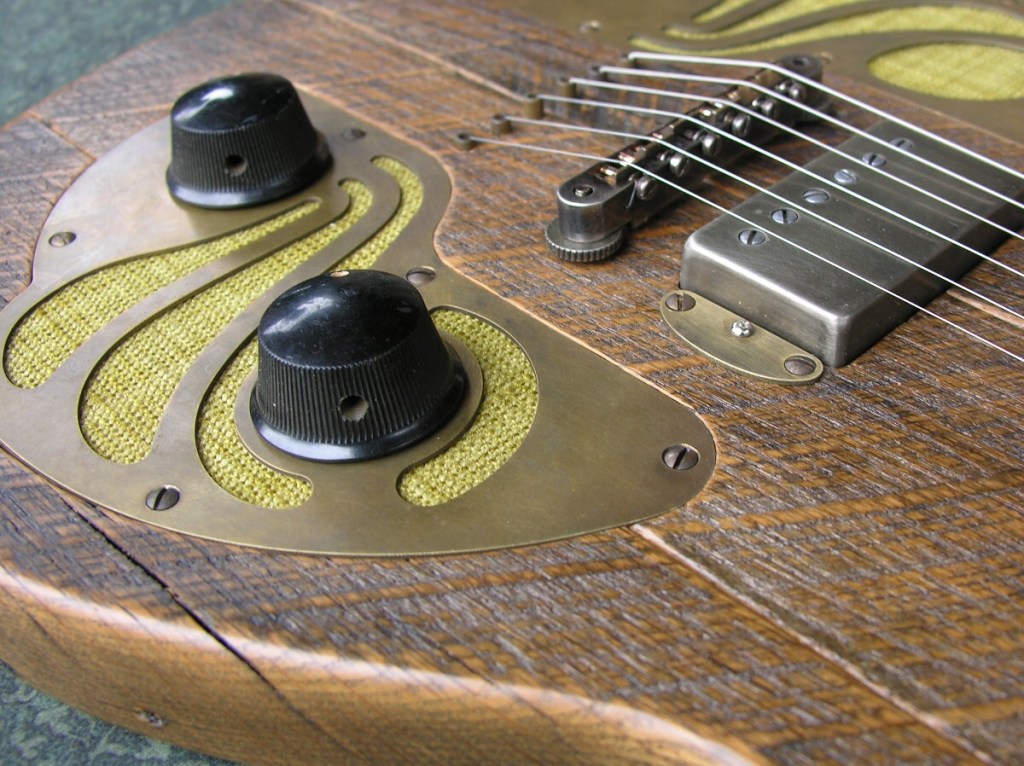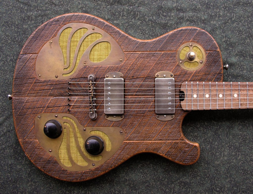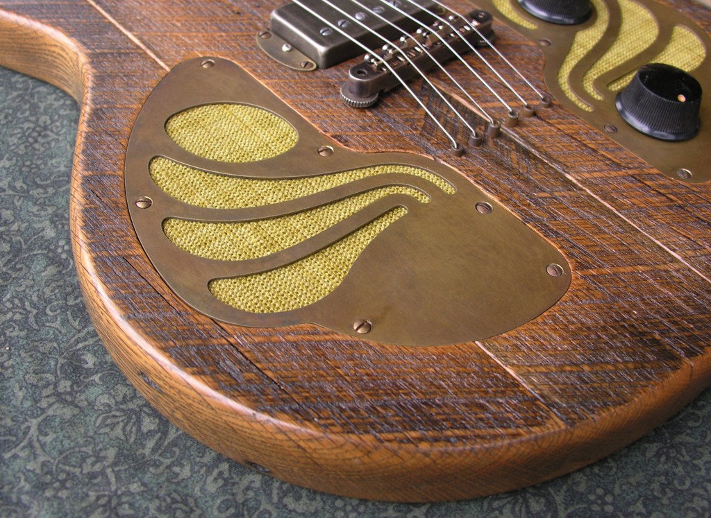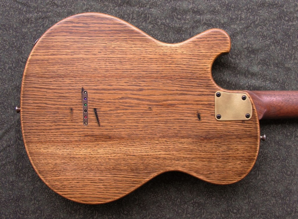 Four piece salvaged white oak body.Walnut neck with persimmon fretboard
