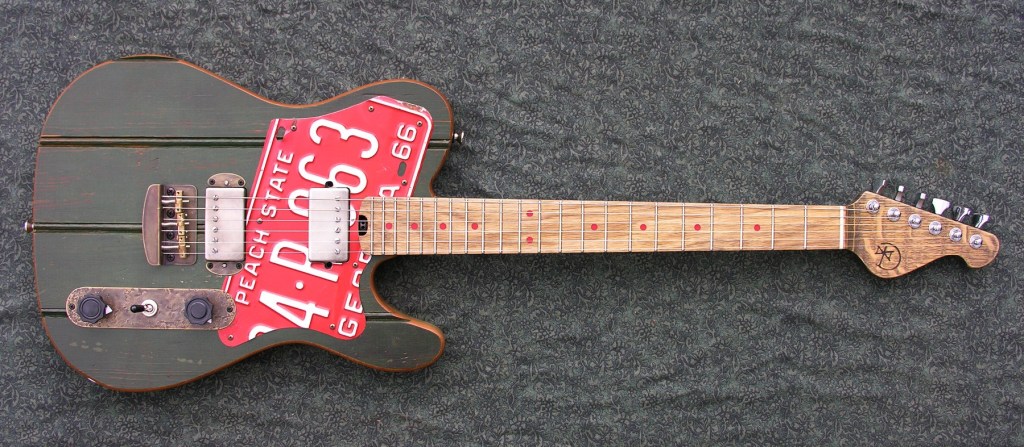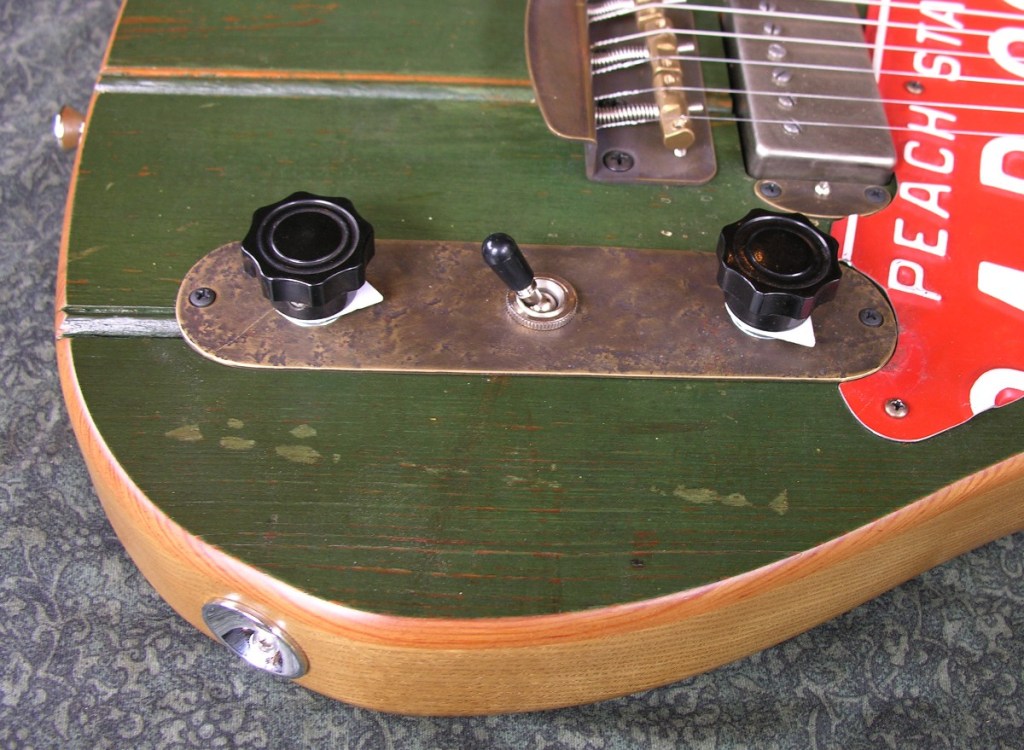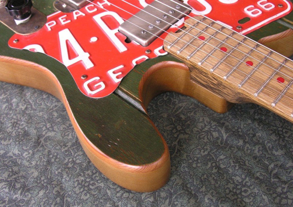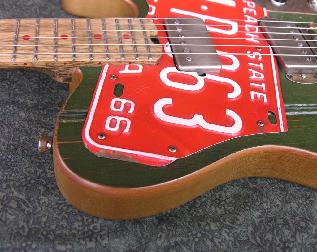 Salvaged pine bead board top with original green paint, on sassafras back.