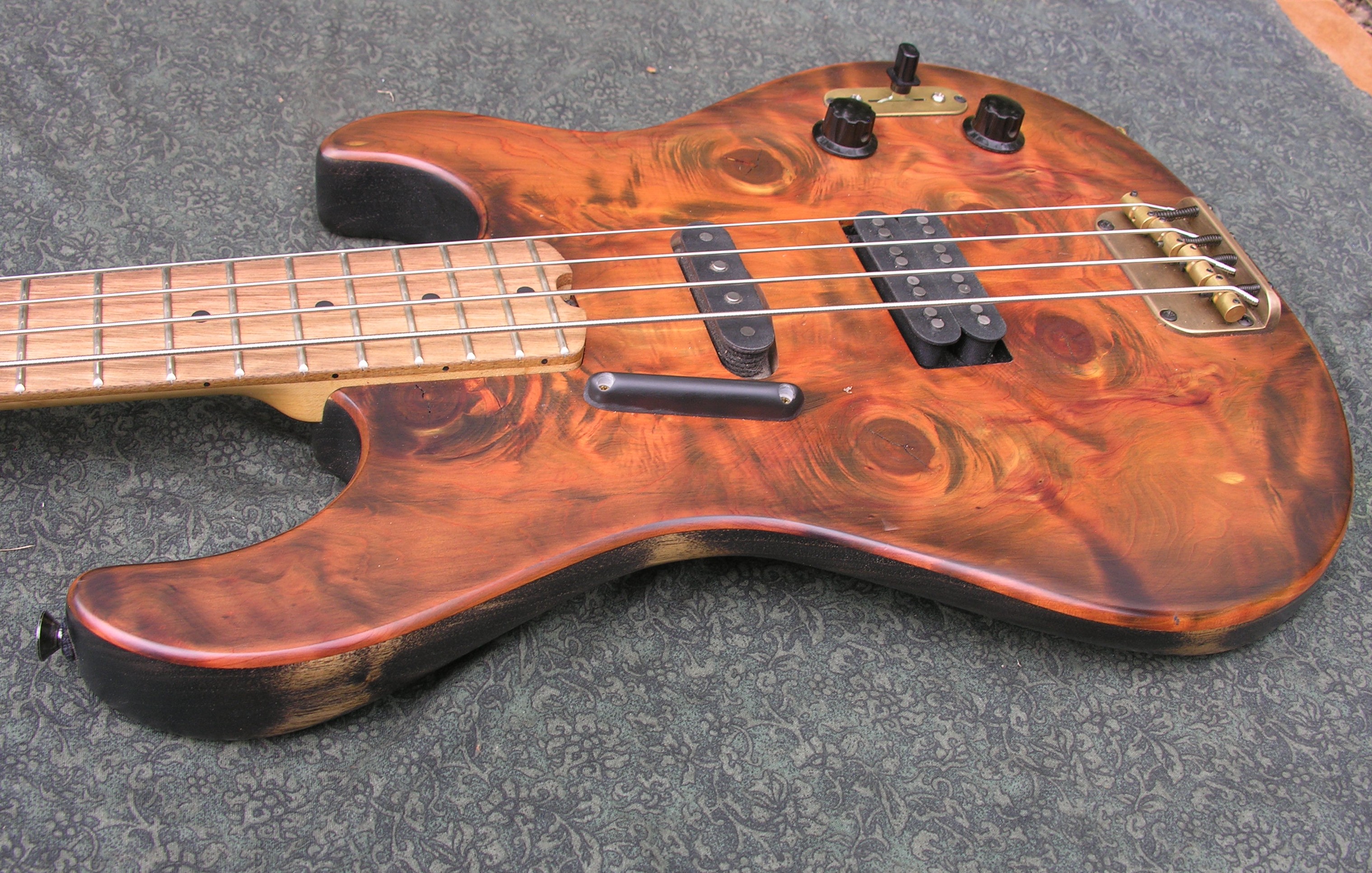 the body is butternut, with a 1/4″ bookmatched knotty eastern red cedar top.