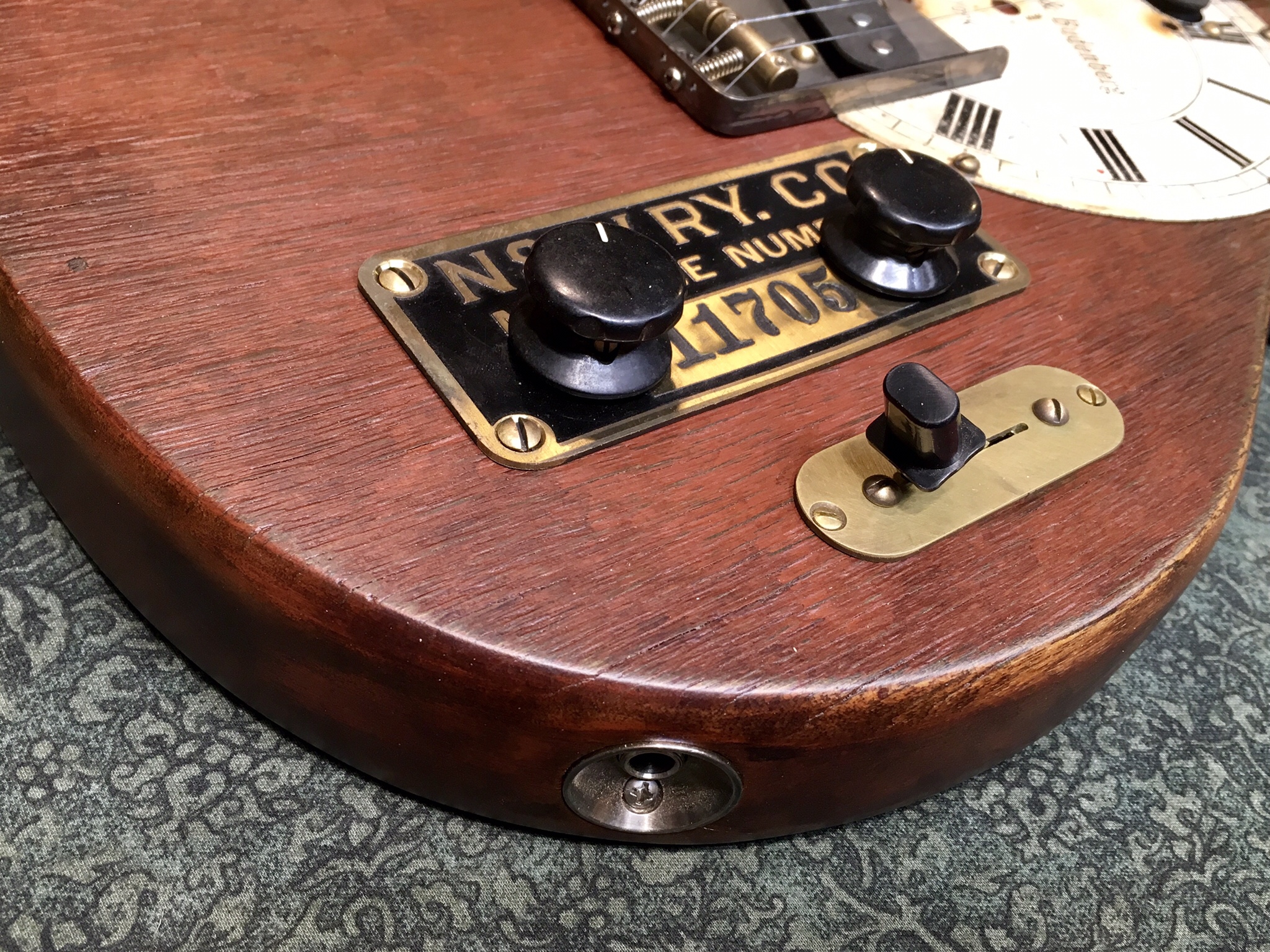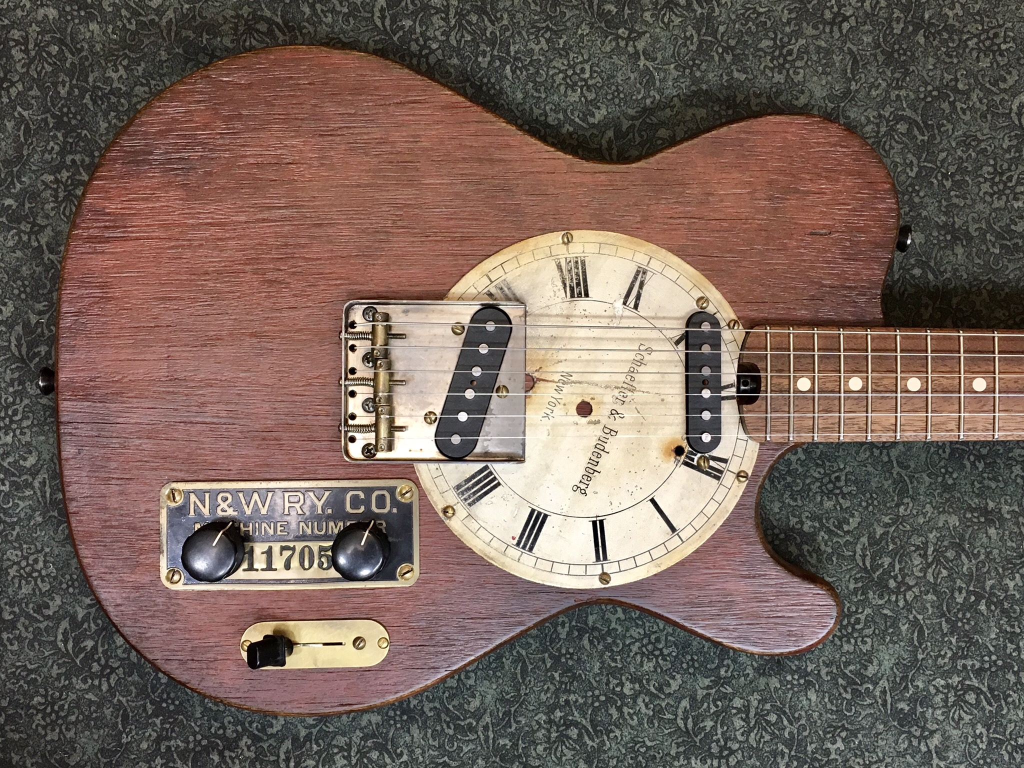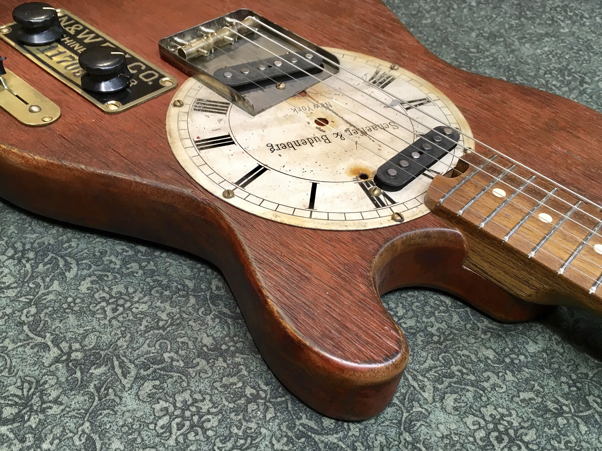 Pickguard is made from an antique clock pan, and control plate from a brass machine plate.