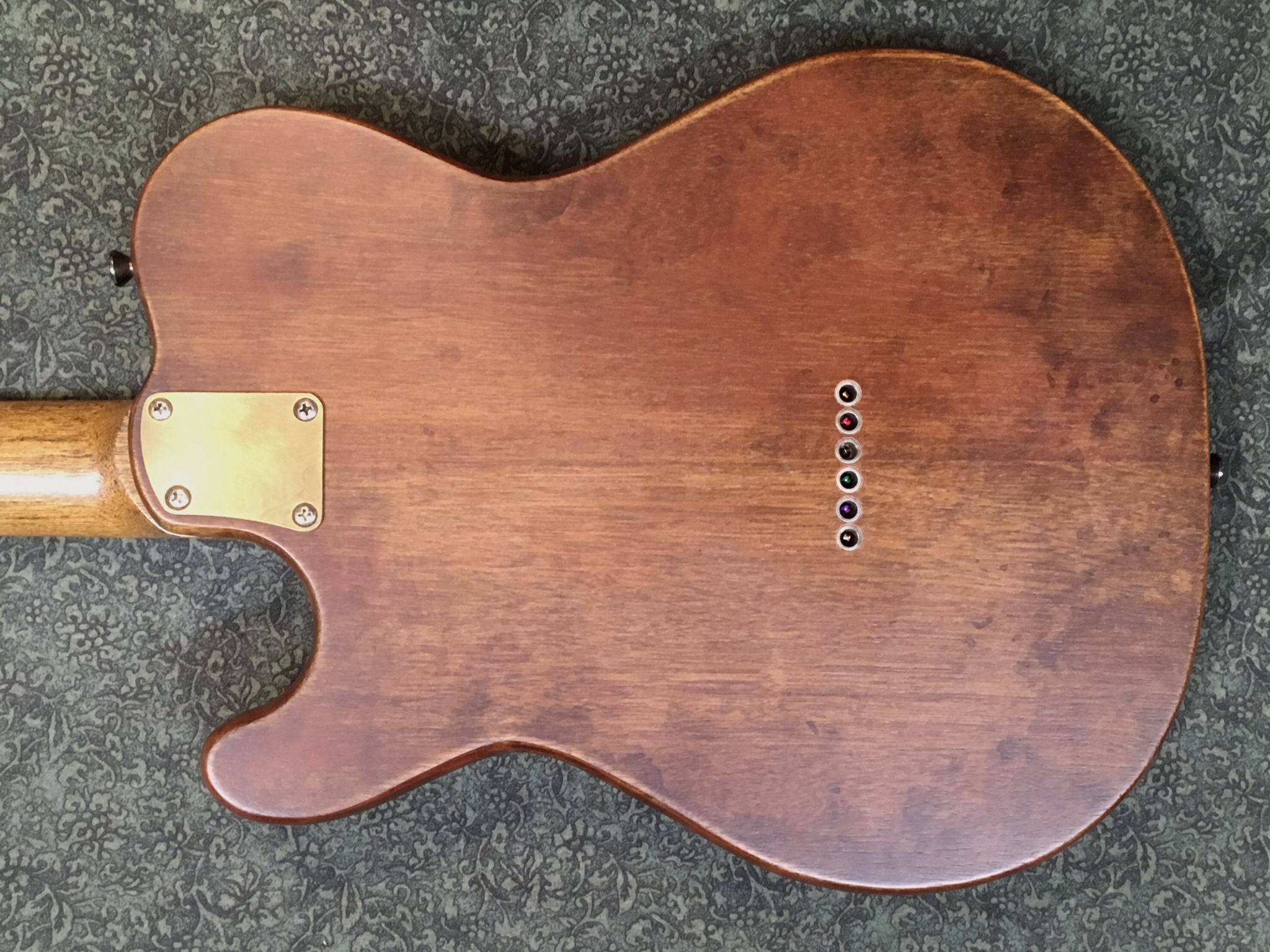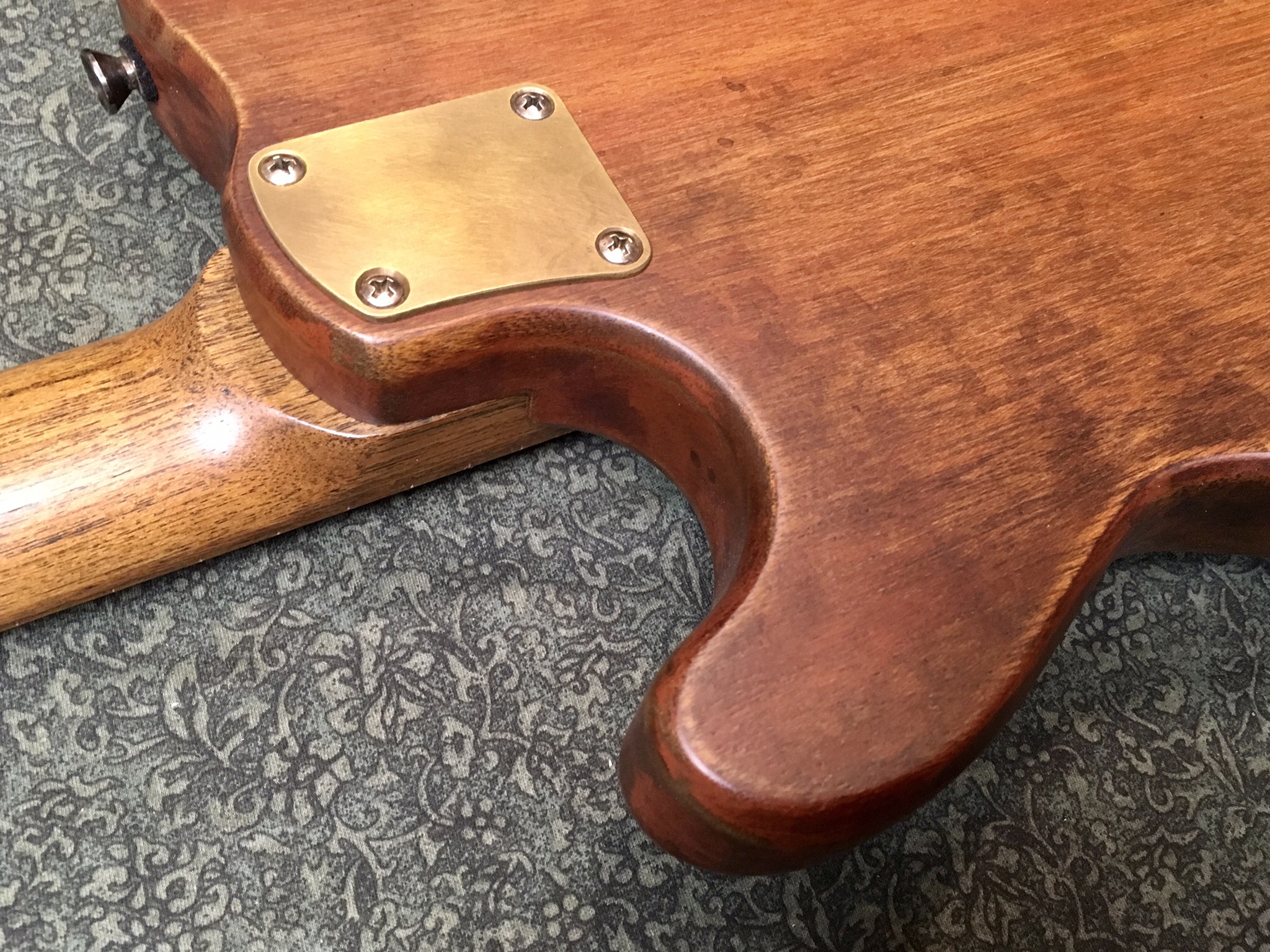 This is the first of a series of guitars in collaboration with Rail Yard Studios, made from a couple different species of mahogany-like timber salvaged from the decking of rail cars built to carry coils of steel.