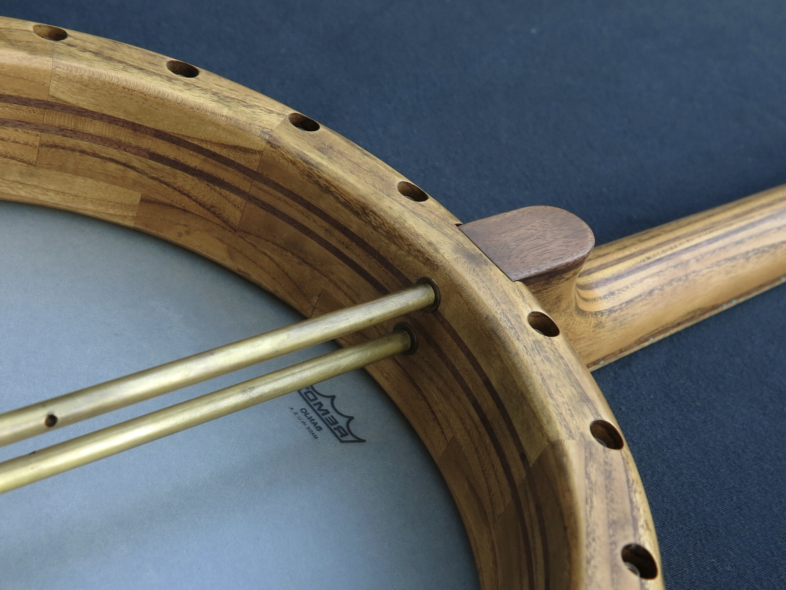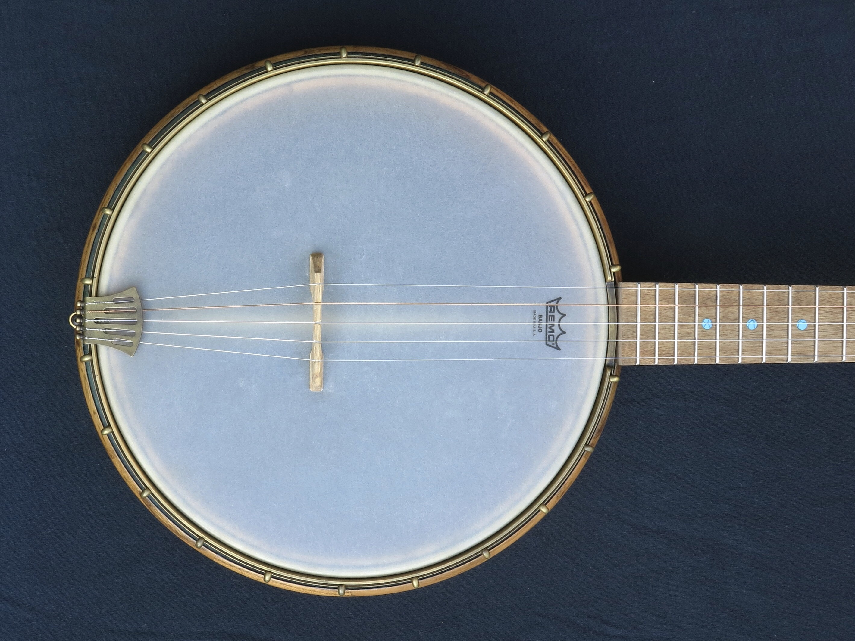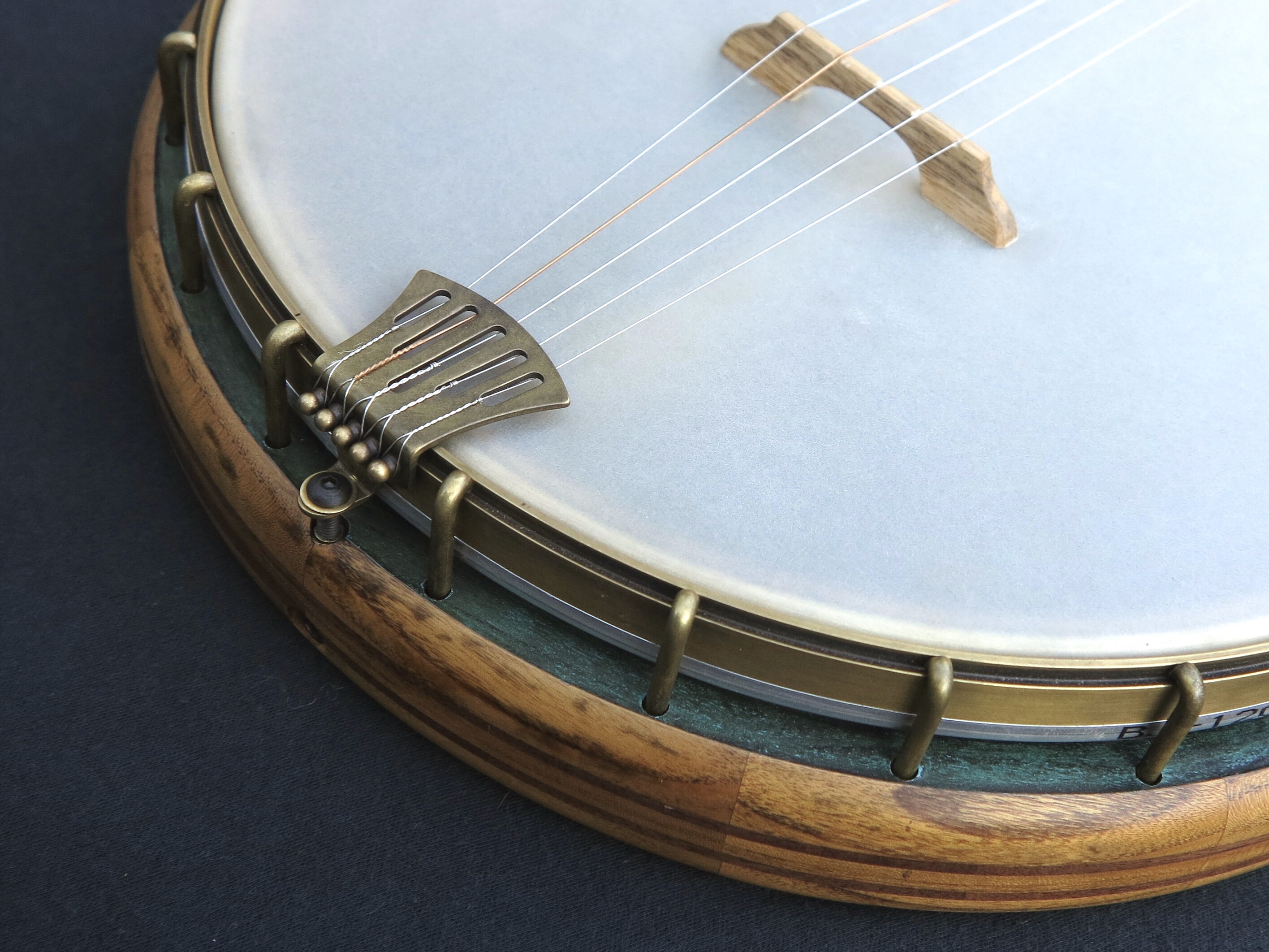 1/4” round brass tone ring and grooved tension hoop by Balsam Banjo Works; Pisgah Hawktail brass tailpiece; Rickard brass coordinator rod set; Waverly planetary tuners.