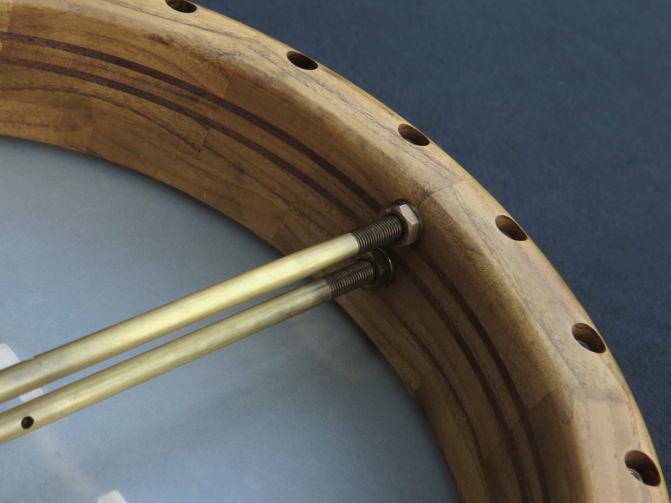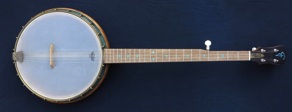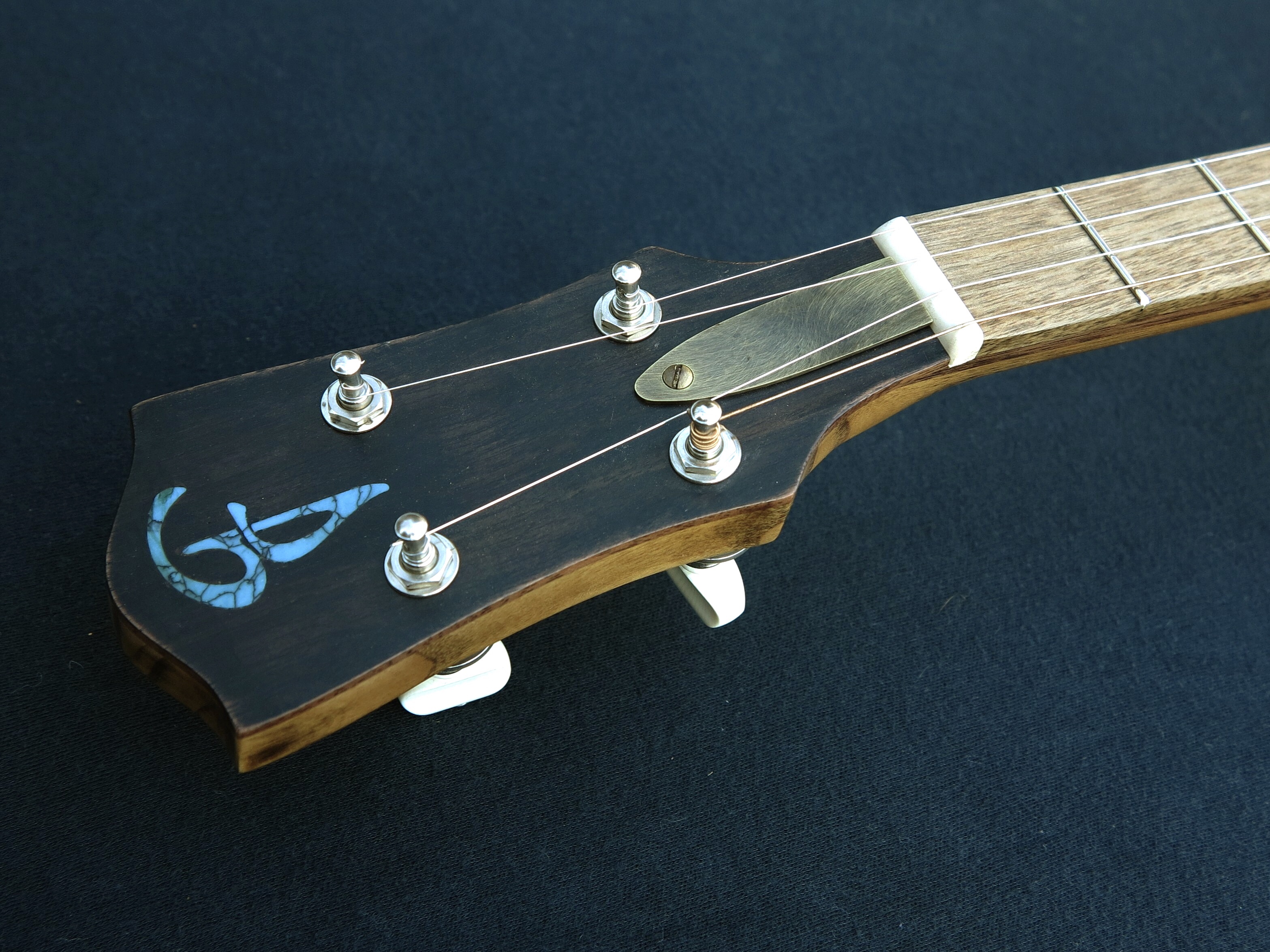 1/4” round brass tone ring and grooved tension hoop by Balsam Banjo Works; Pisgah Hawktail brass tailpiece; Rickard brass coordinator rod set; Waverly planetary tuners.