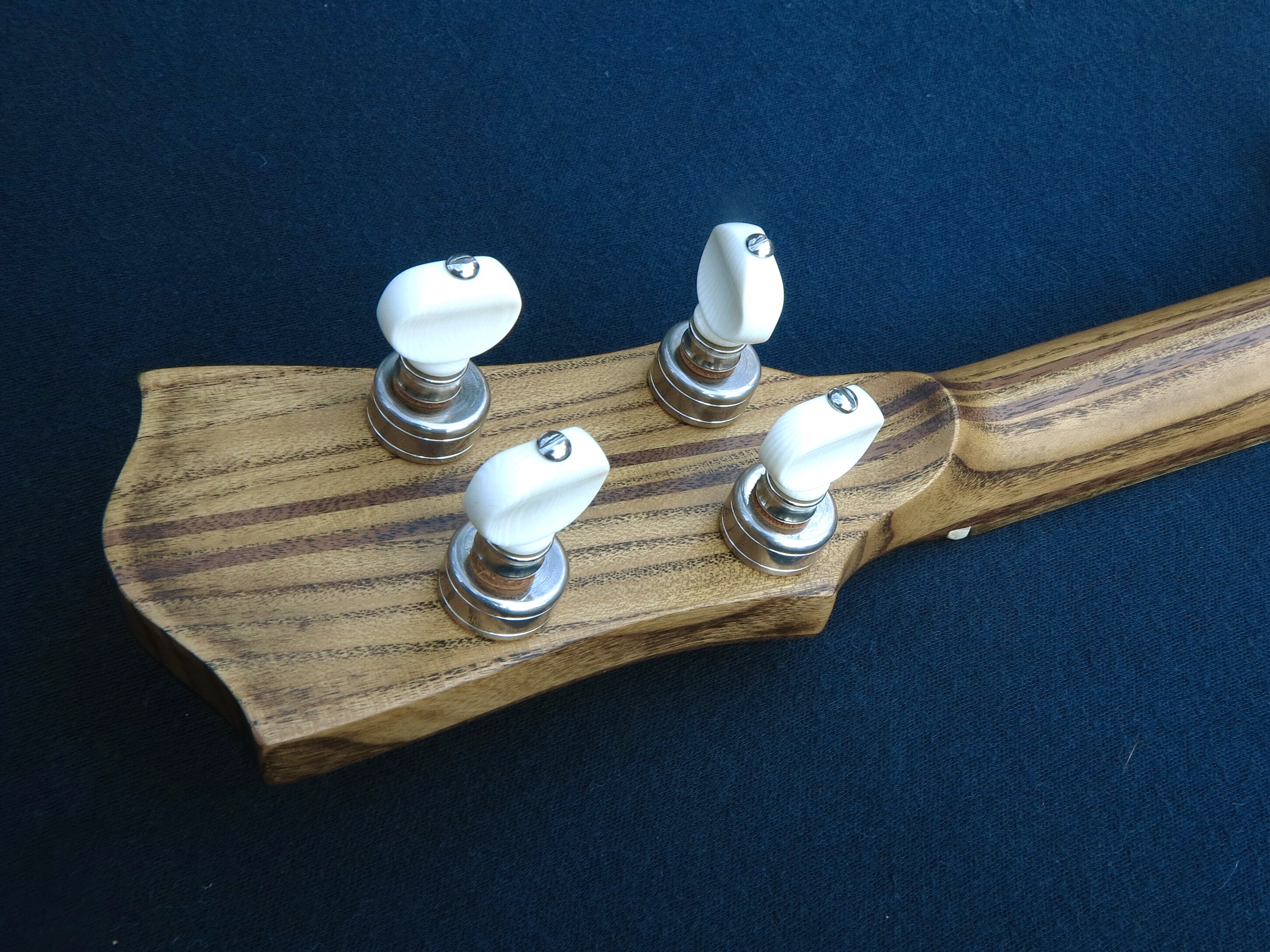 This was a custom commission for a friend. It’s the first banjo I have built both the neck and rim for, and really the first fully acoustic instrument I have successfully built. The rim is composed of alternating segmented layers of red mulberry and walnut, with an integral flange, instead of the more common array of metal brackets; with the tension nuts recessed in the back. The neck features the same woods, in a complimentary arrangement, with a persimmon fretboard. The headstock inlay and position markers are turquoise recon stone, and I recessed the area around the tension hooks, and painted it a similar color milk paint.