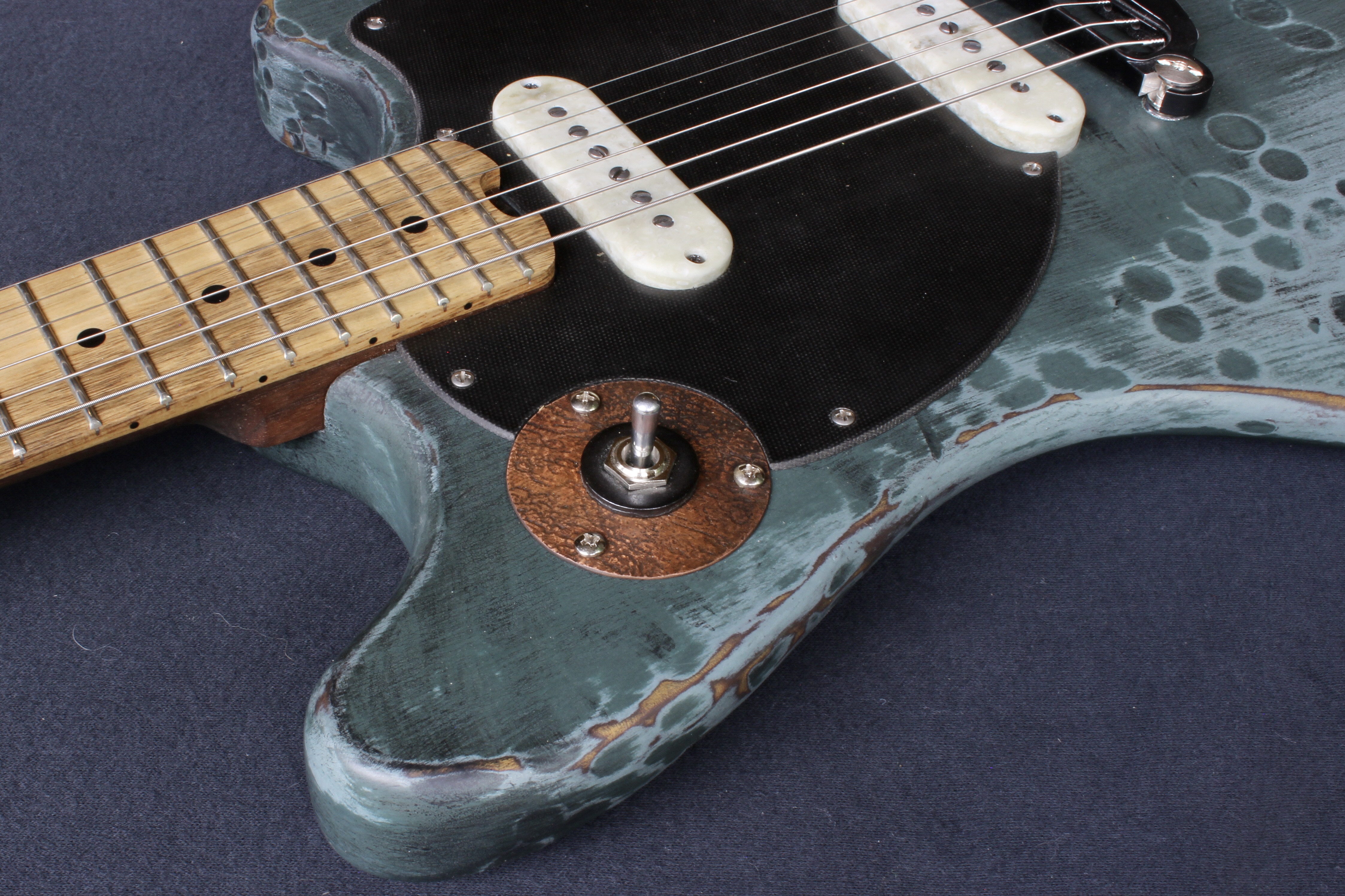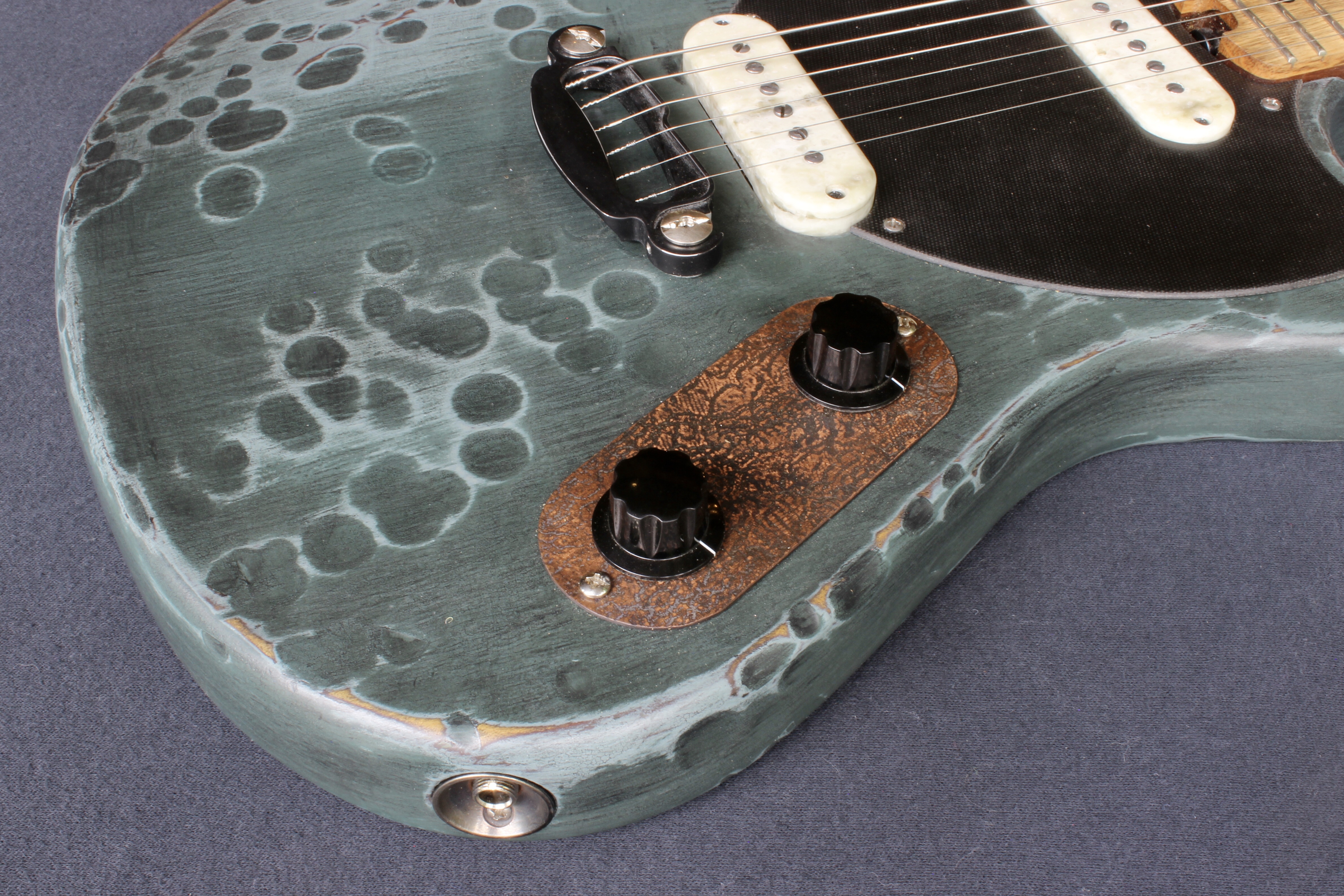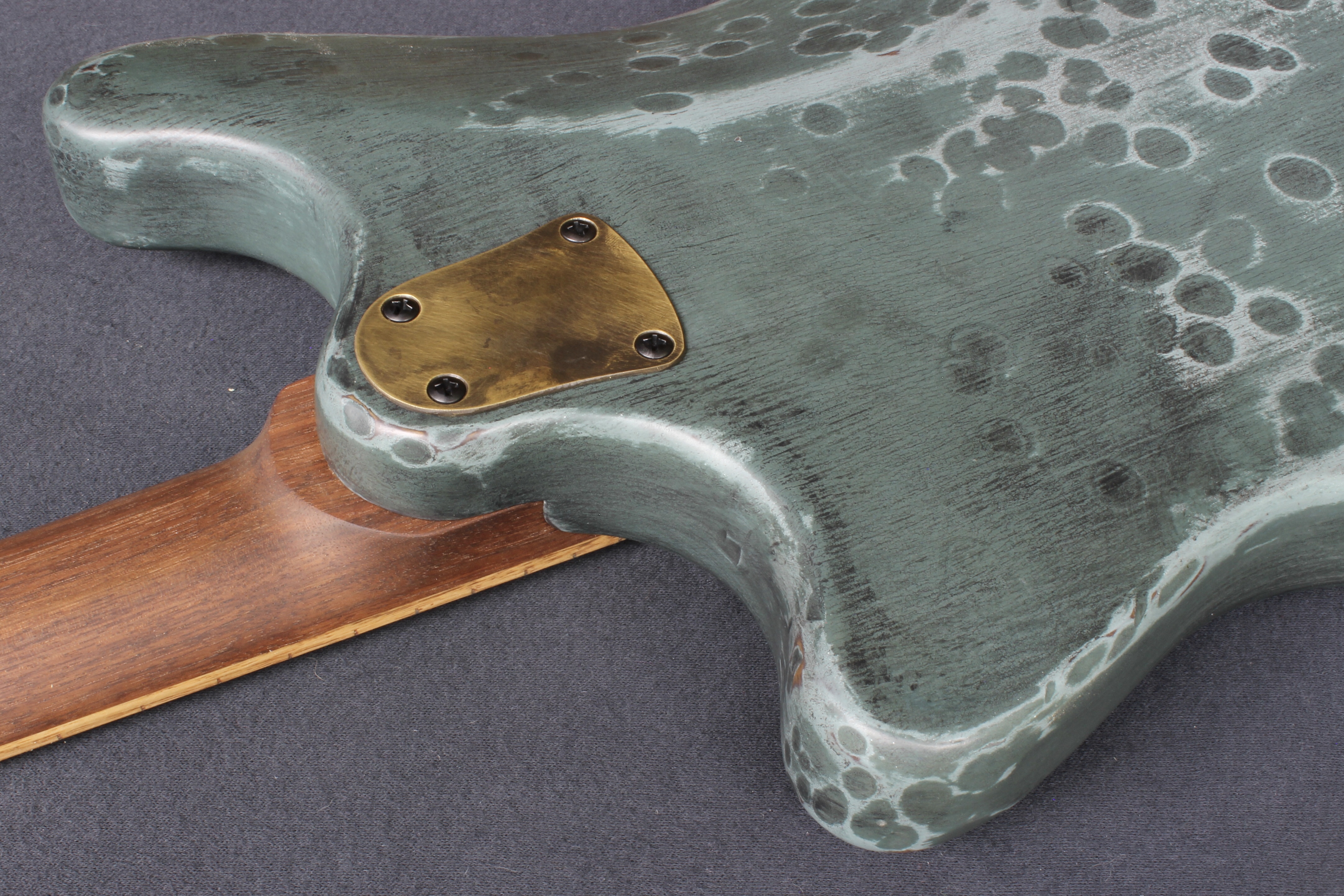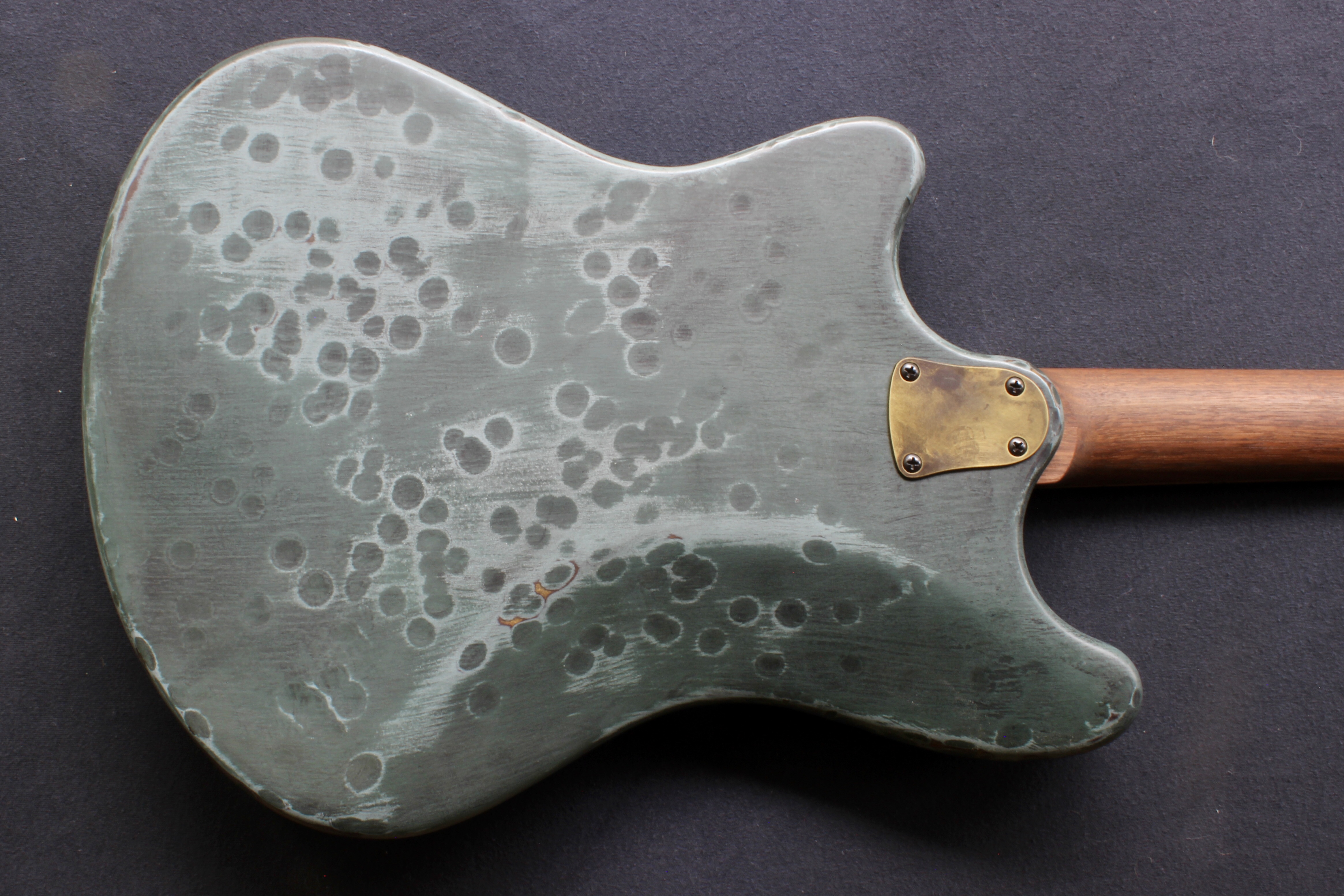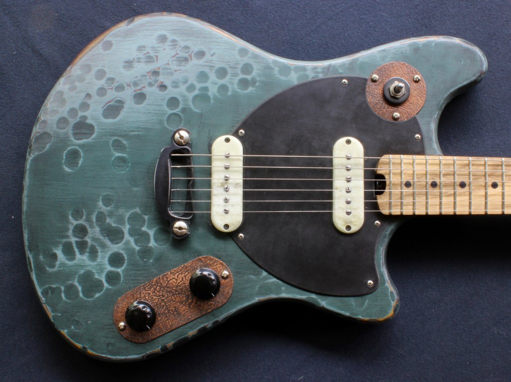 This one has a cucumbertree body with a walnut neck and persimmon fretboard. Pickups are a p-90ish version of my homespun single coils. Aluminum compensated bridge/tailpiece combo and Hipshot classic tuners. 25” scale, 22 frets. Weighs 6.6 pounds