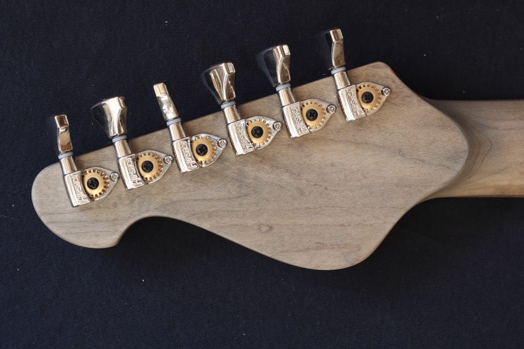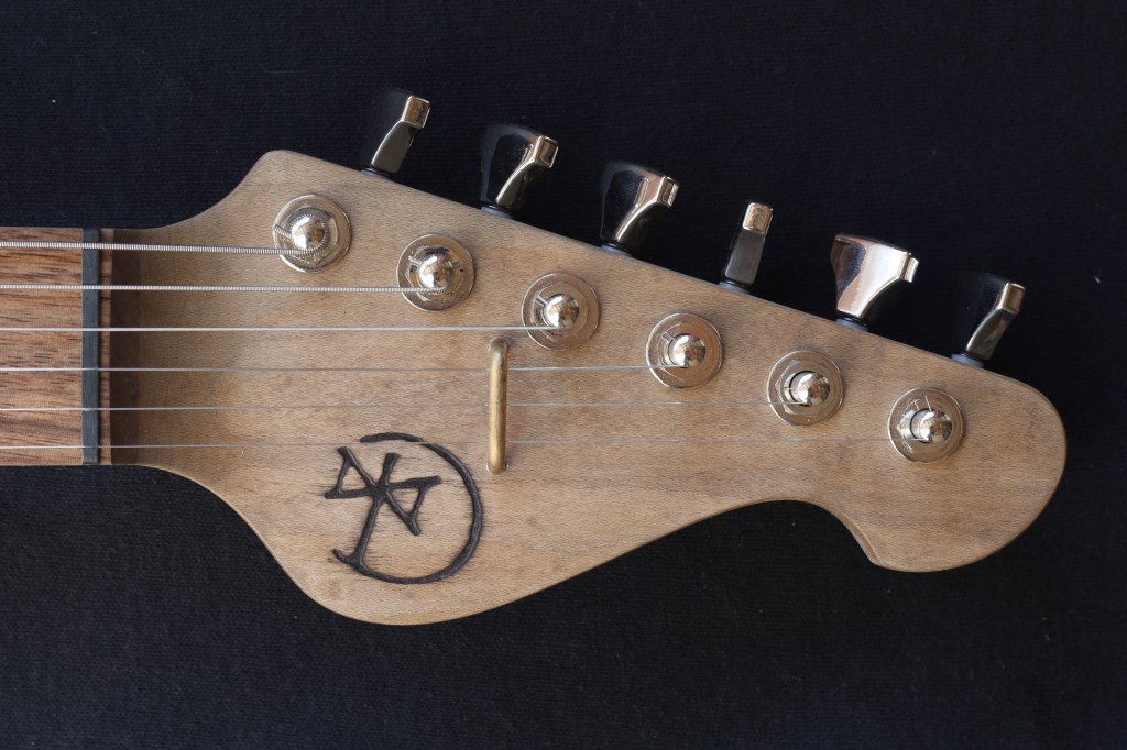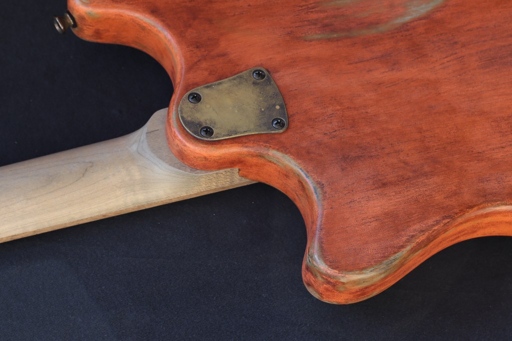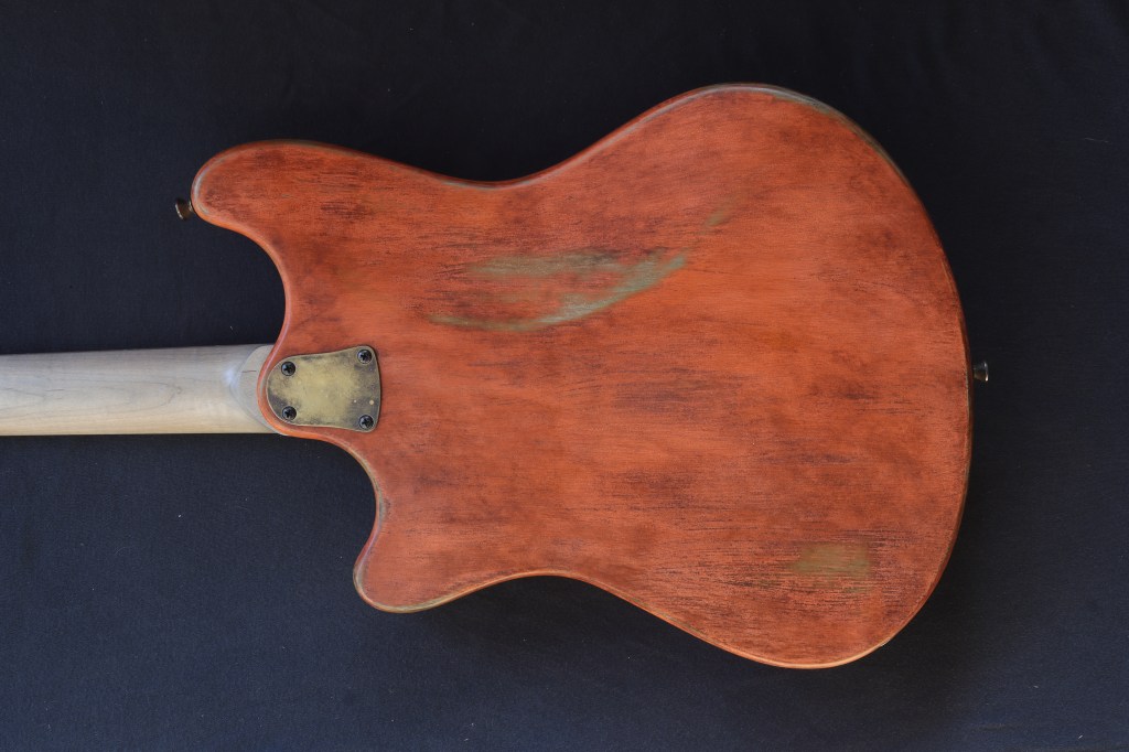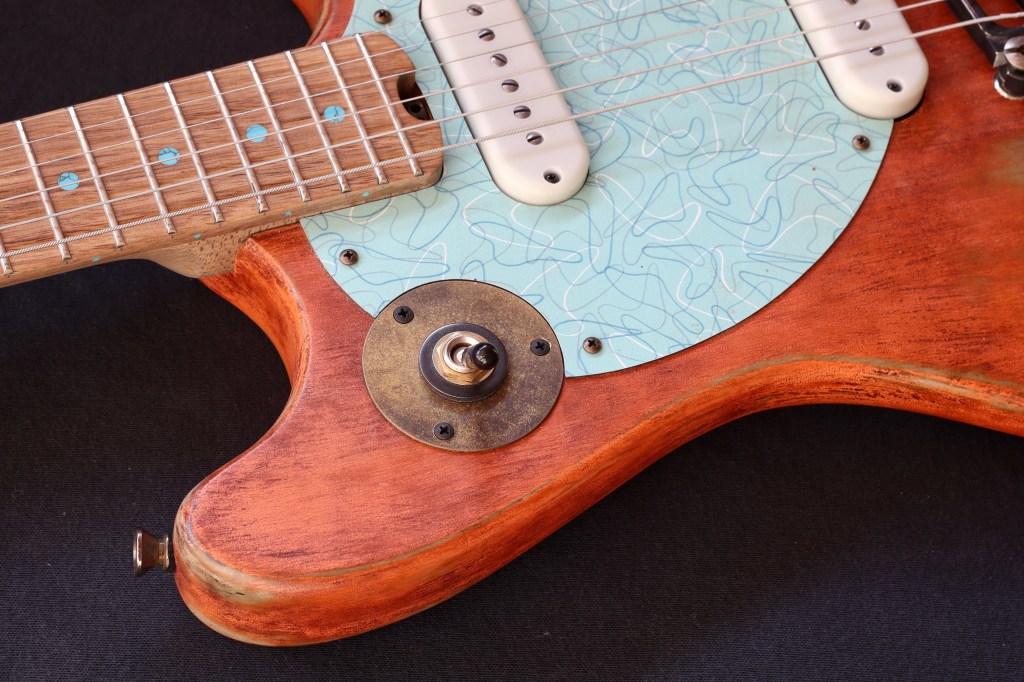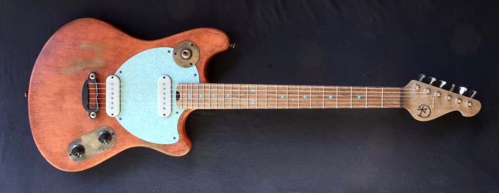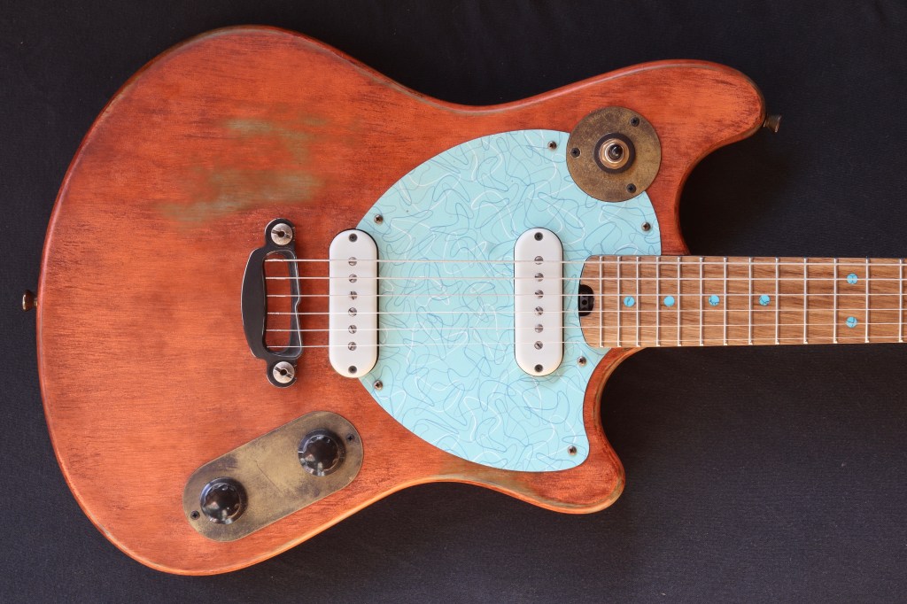 This was a custom commission for Swan Real, who really liked Undine #2105, which had already sold. Fortunately I still had some of the same color milk paint, so I was able to make another, with different bridge and pickups as requested. Body is basswood. Neck is maple, with persimmon fretboard and turquoise recon stone markers. Aqua Boomerang Formica pickguard. Aluminum compensated bridge/tailpiece combo, Hipshot classic tuners. Homespun P90ish pickups; 8.4K/7k DCR Weighs 6.7 pounds.