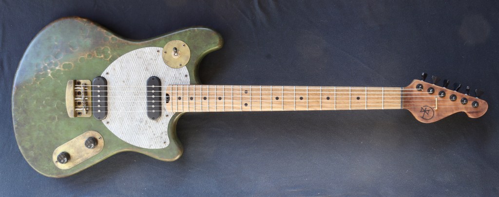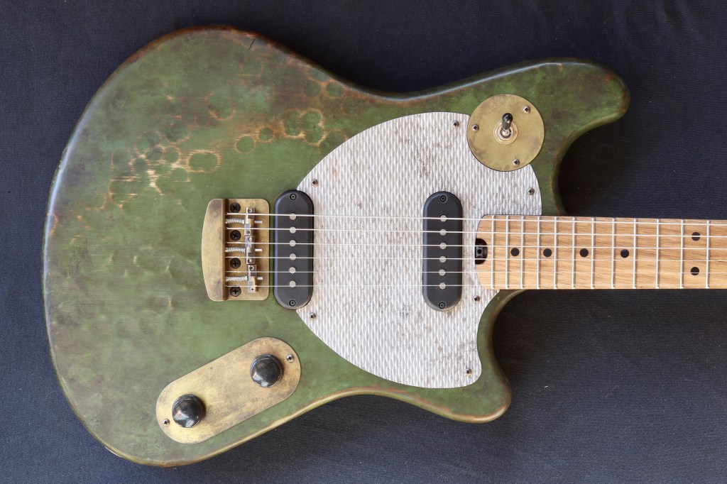 Butternut body with green milk paint finishCherry neck with persimmon fretboardSalvaged textured aluminum sheet pickguard Homespun single coil pickups, 6.8k/5.7k dcrWeights 6.5 pounds.