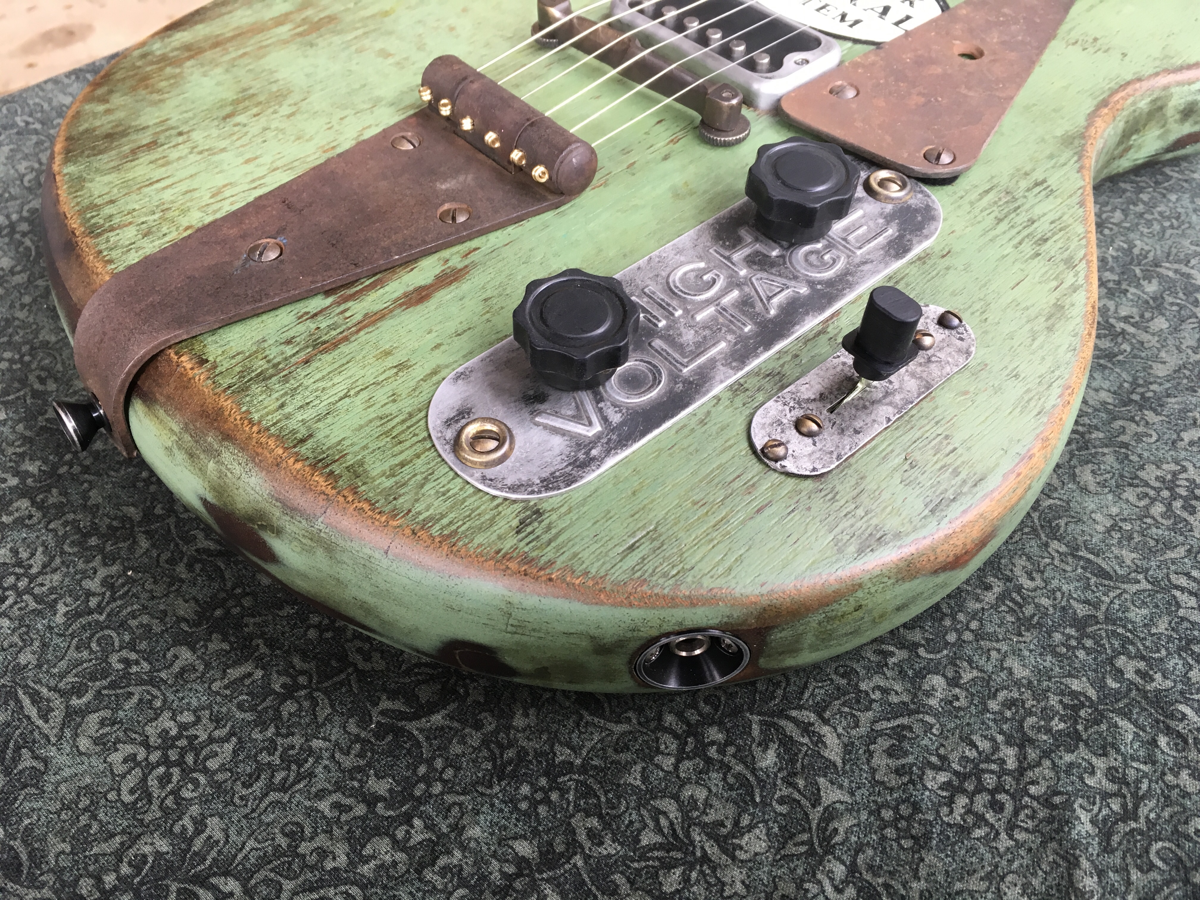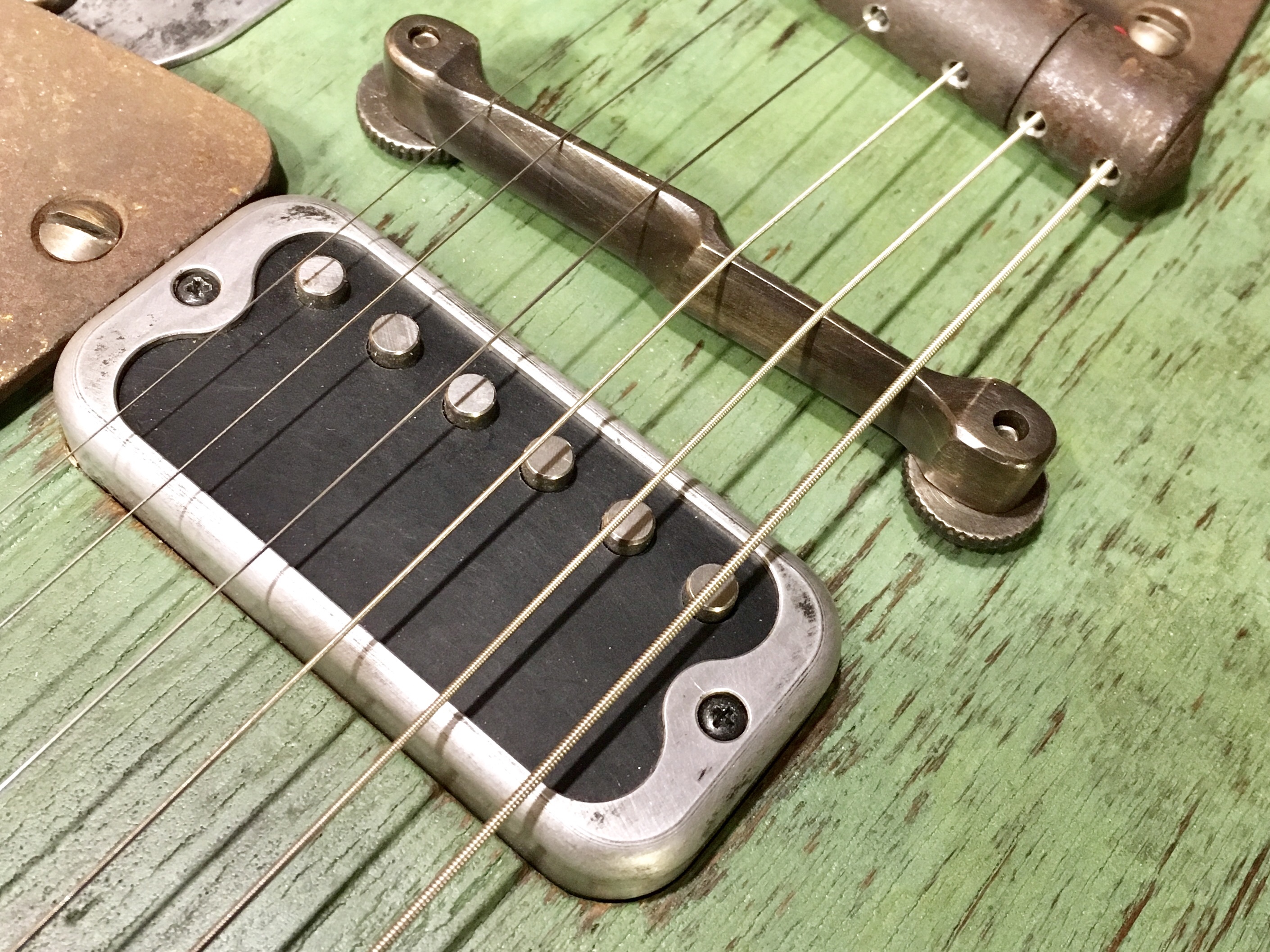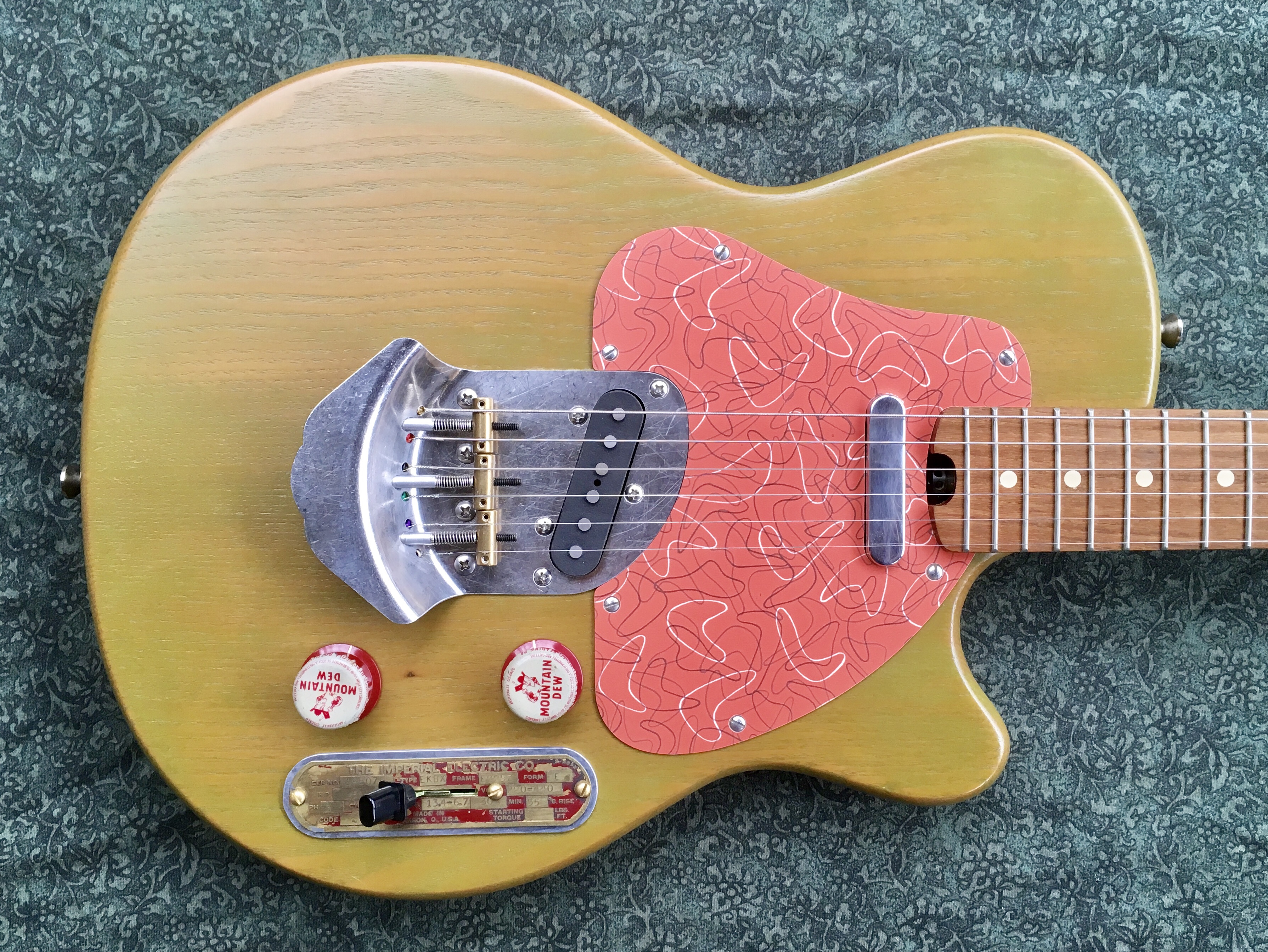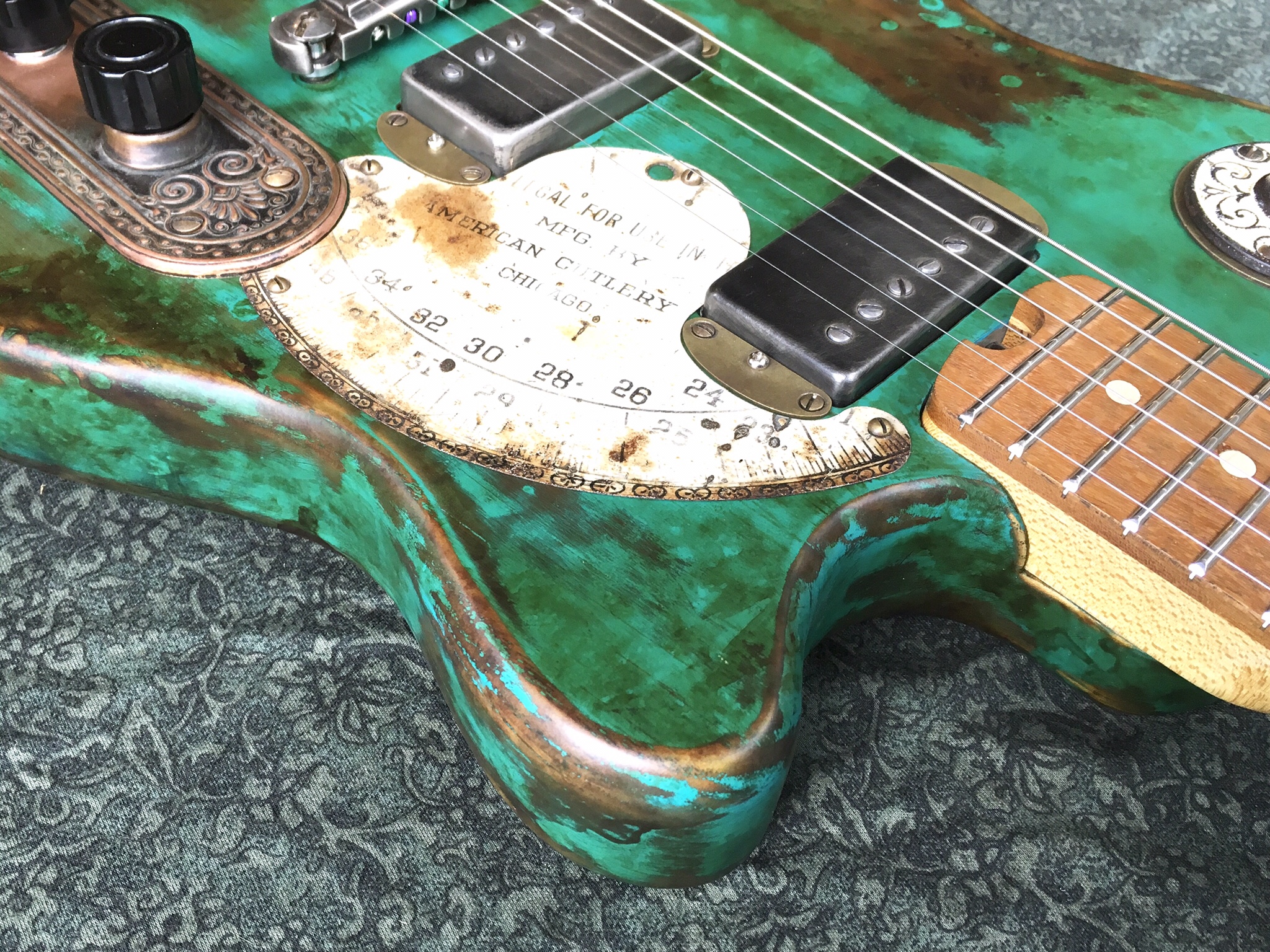 The finish is milk paint, in a color decidedly reminiscent of the “avocado” enamel on many mid-last-century appliances, as inspired by the “Frigidaire” name badge I used as a switch bezel. The pickguard, as well, is cut from a diamond-textured sheet of thin aluminum which looks like it came from the inside of a freezer. The Bigsby B12 tailpiece also resembles a piece of old icebox hardware.