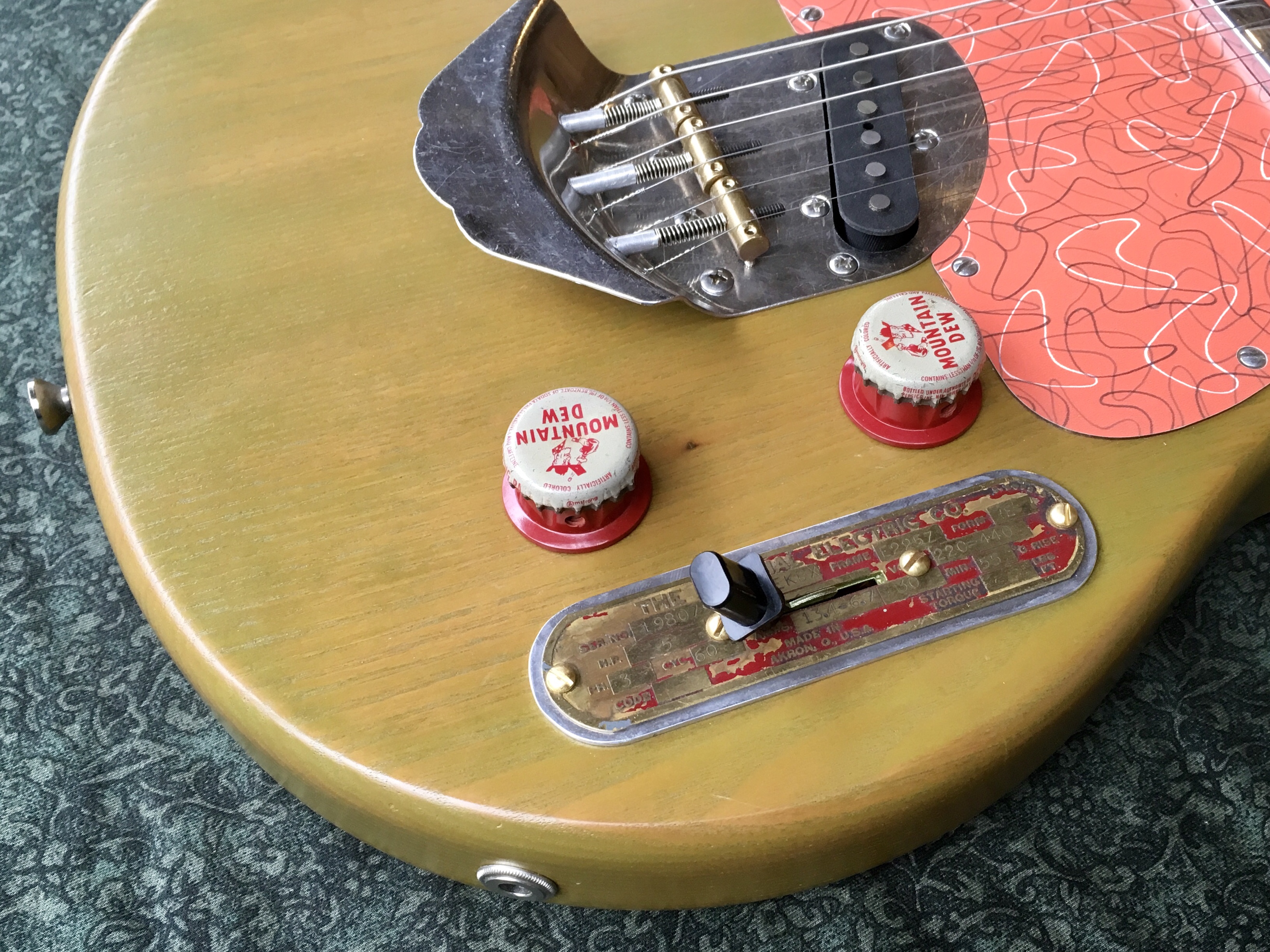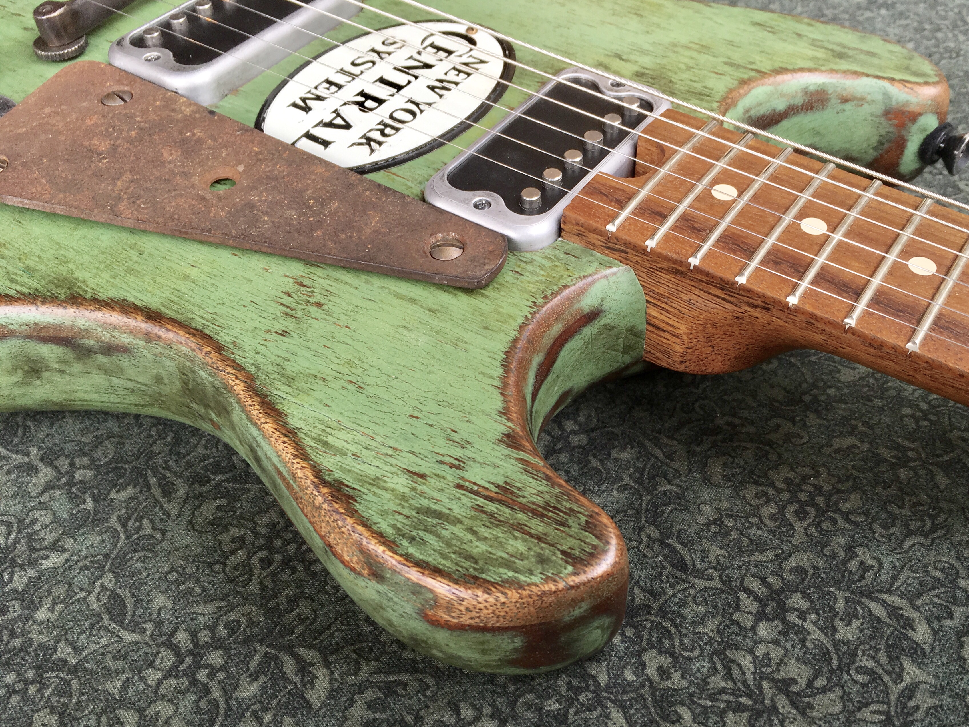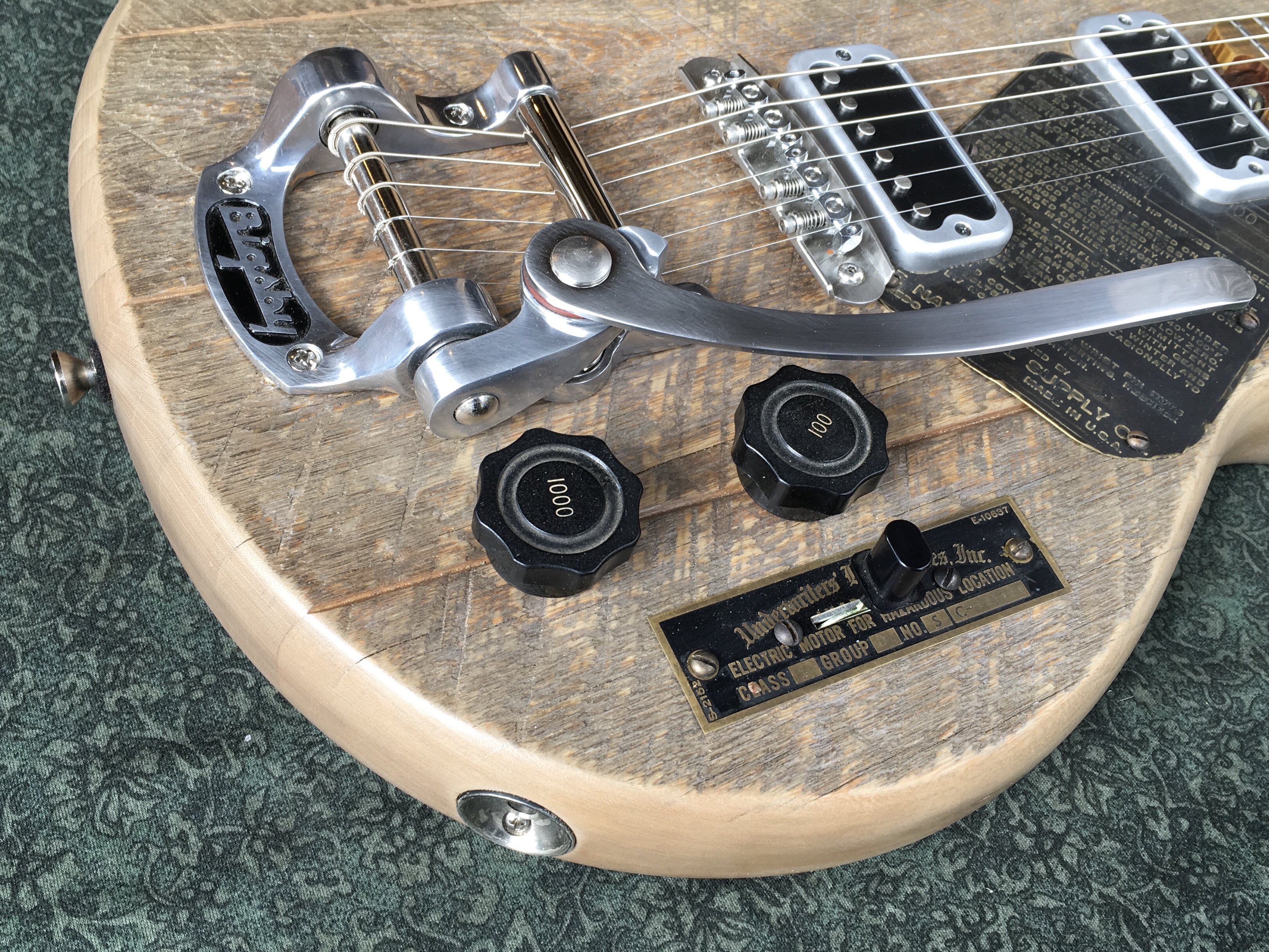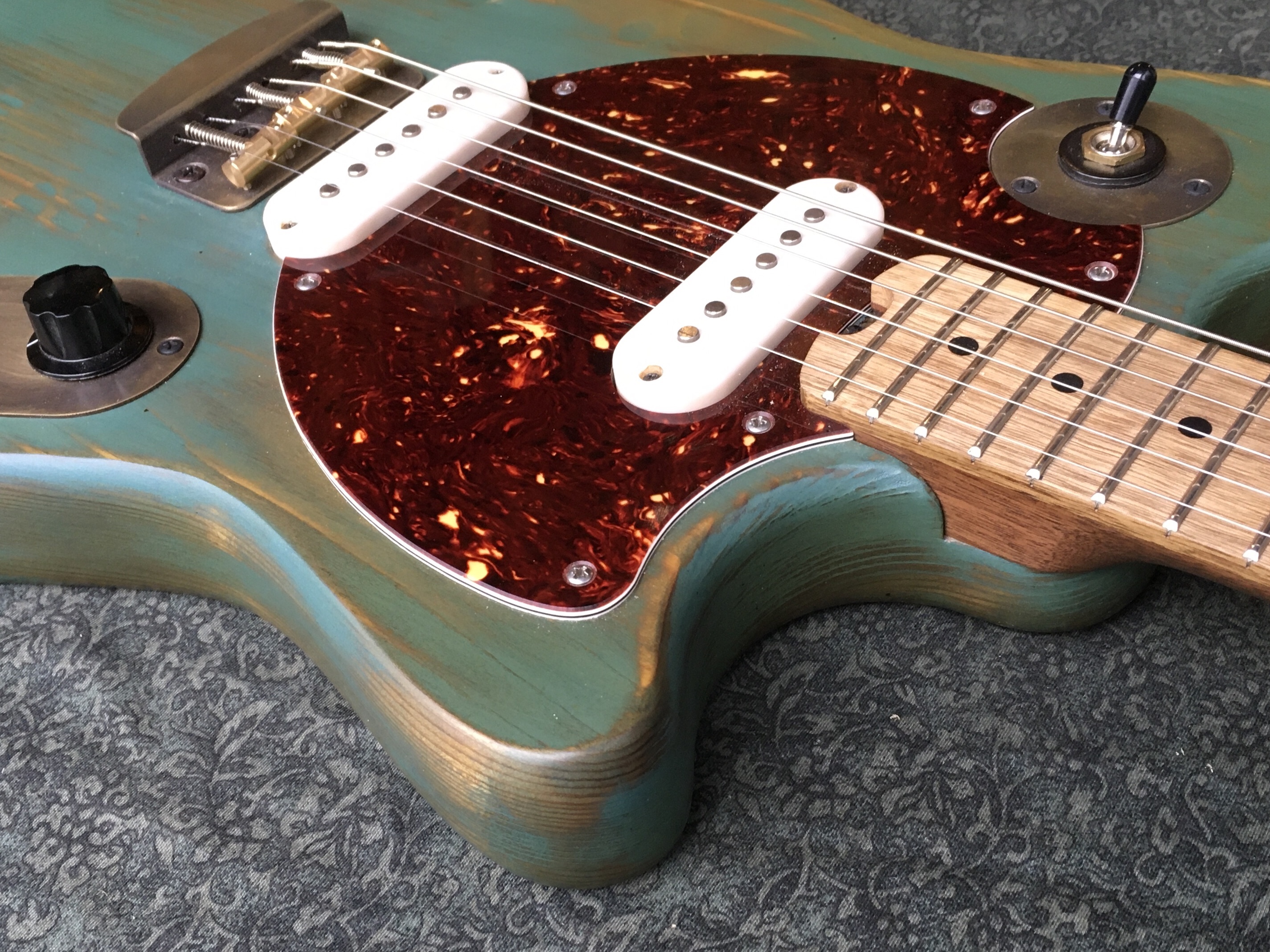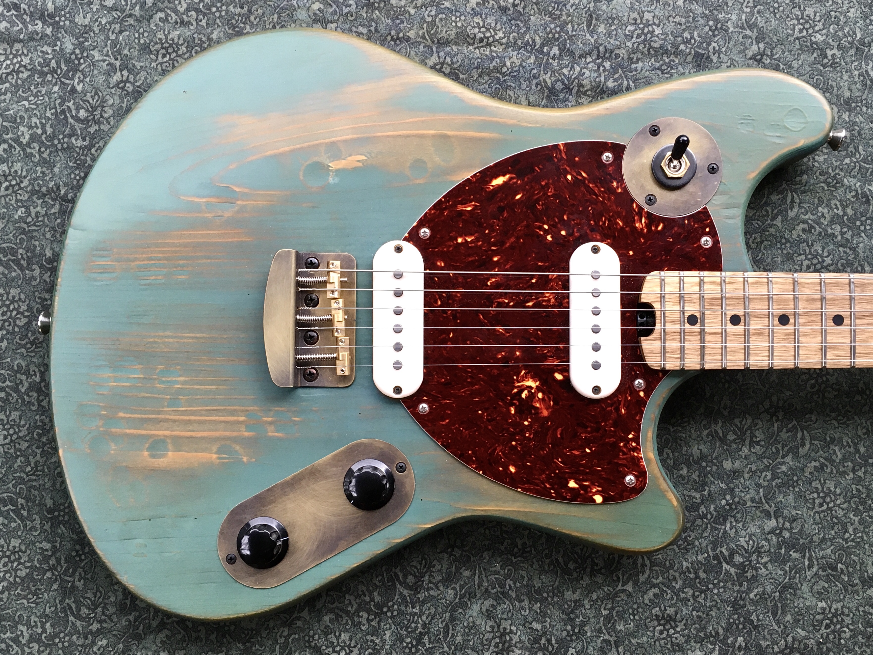 The finish is milk paint, in a color decidedly reminiscent of the “avocado” enamel on many mid-last-century appliances, as inspired by the “Frigidaire” name badge I used as a switch bezel. The pickguard, as well, is cut from a diamond-textured sheet of thin aluminum which looks like it came from the inside of a freezer. The Bigsby B12 tailpiece also resembles a piece of old icebox hardware.