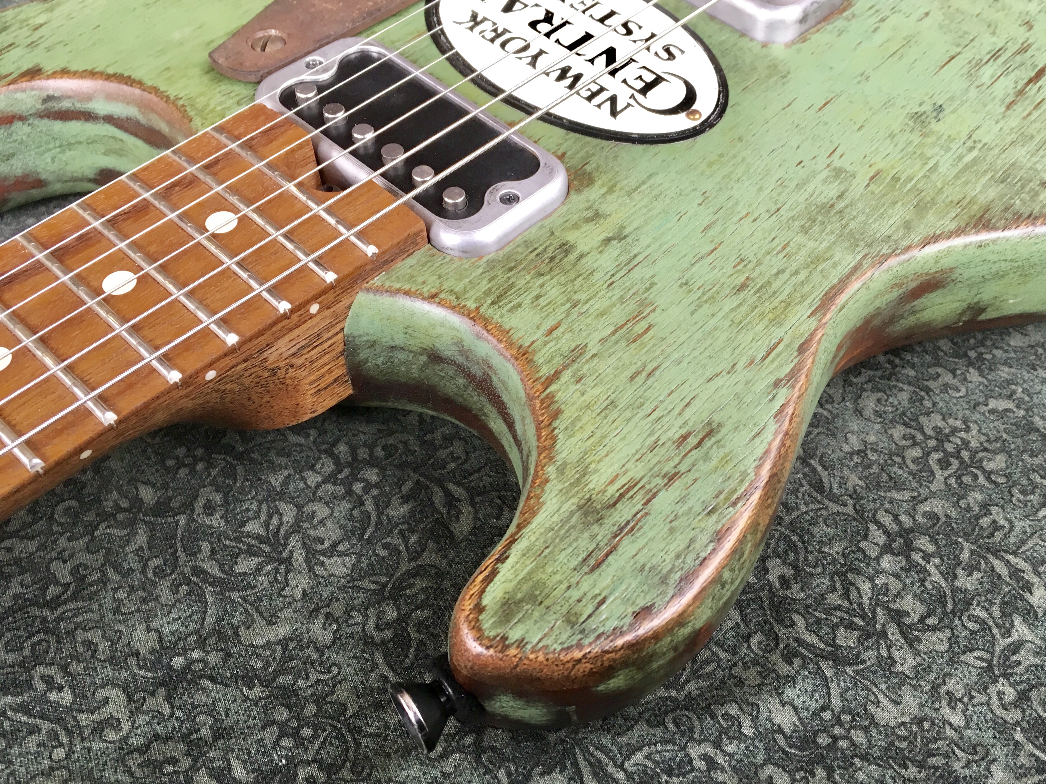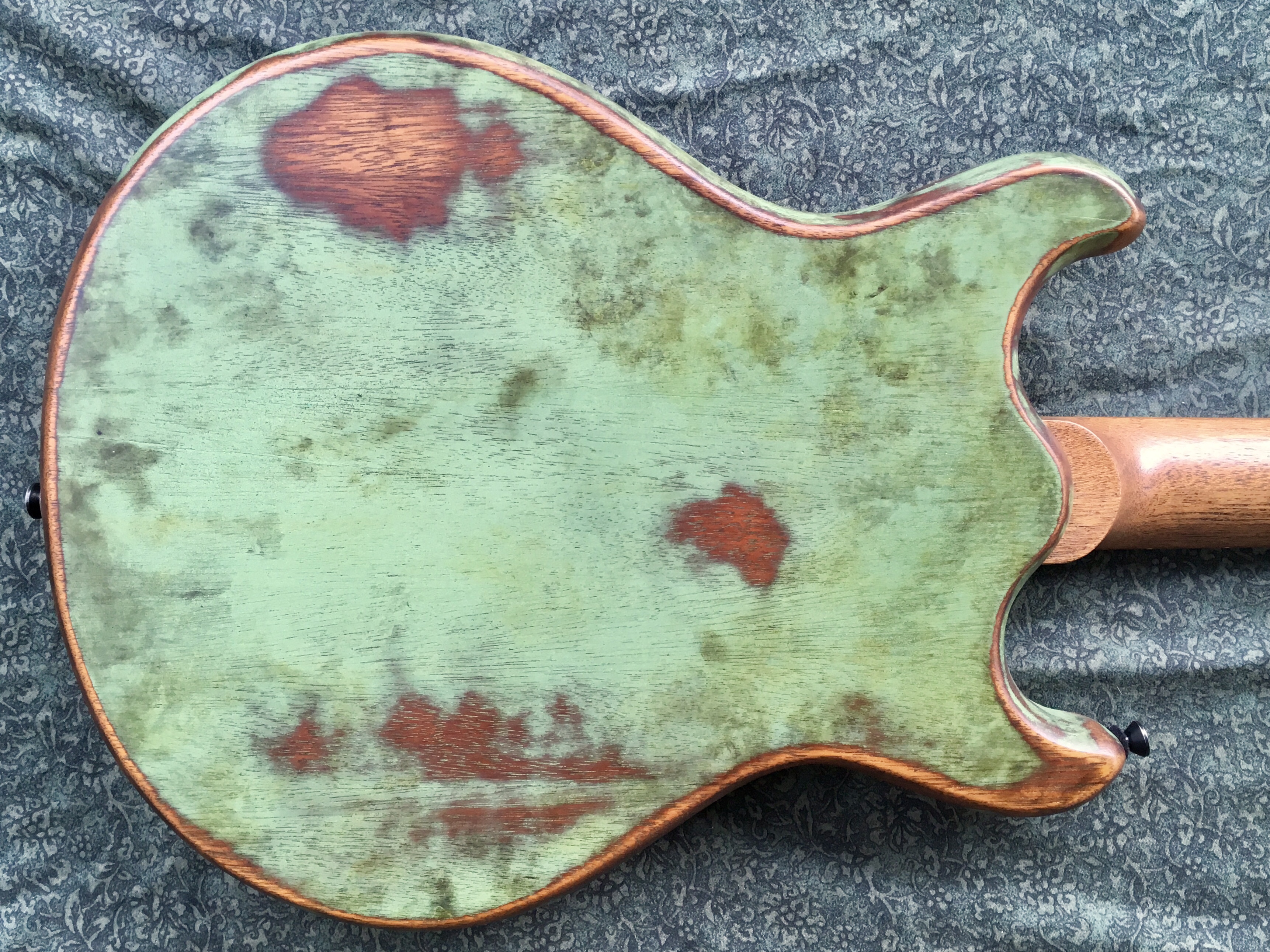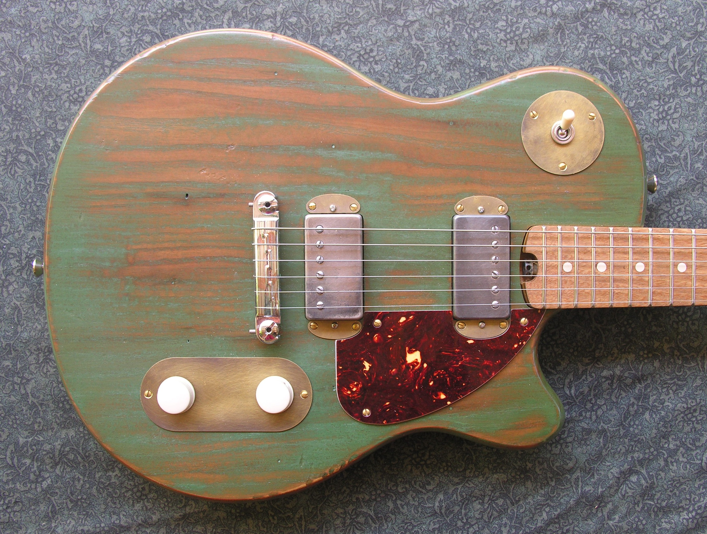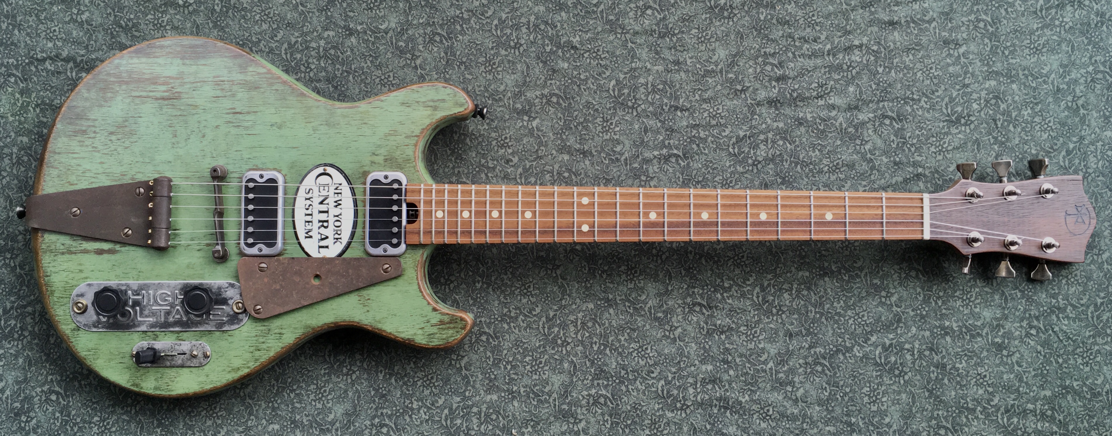 The finish is milk paint, in a color decidedly reminiscent of the “avocado” enamel on many mid-last-century appliances, as inspired by the “Frigidaire” name badge I used as a switch bezel. The pickguard, as well, is cut from a diamond-textured sheet of thin aluminum which looks like it came from the inside of a freezer. The Bigsby B12 tailpiece also resembles a piece of old icebox hardware.