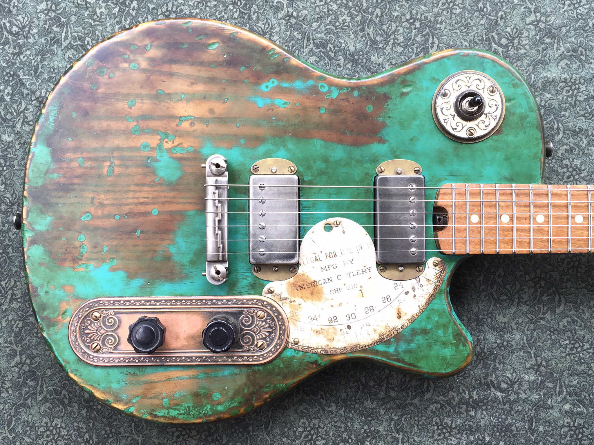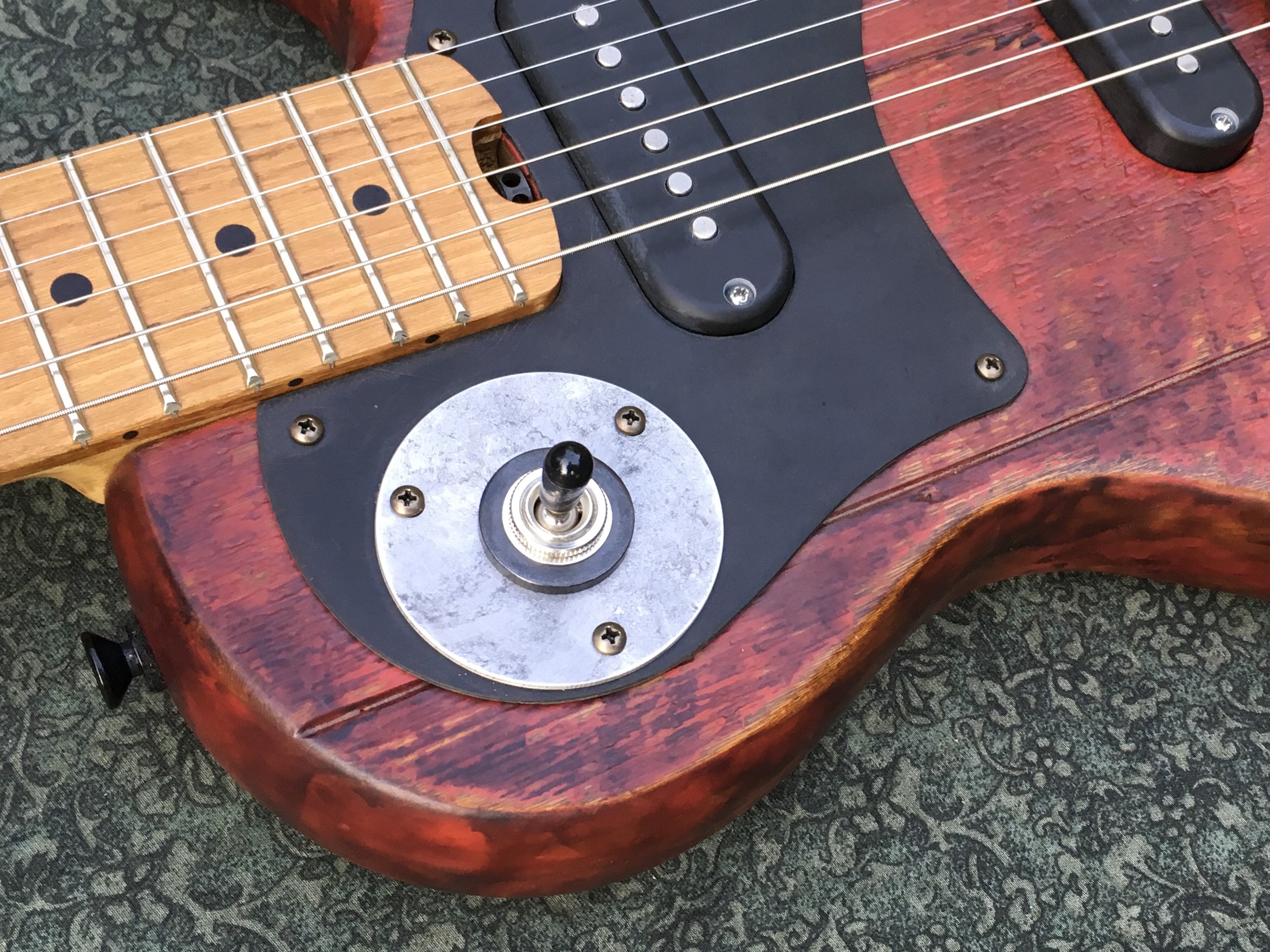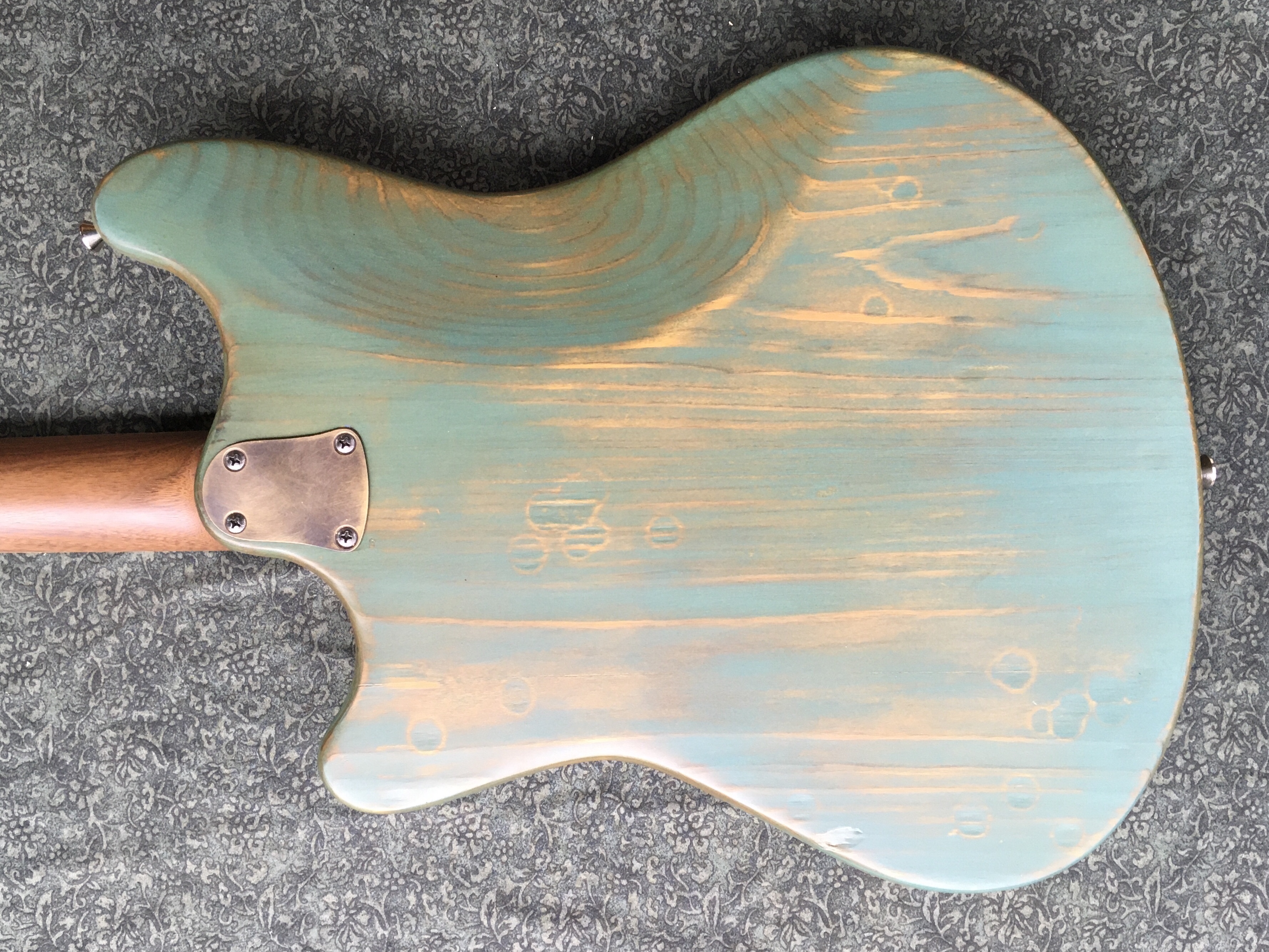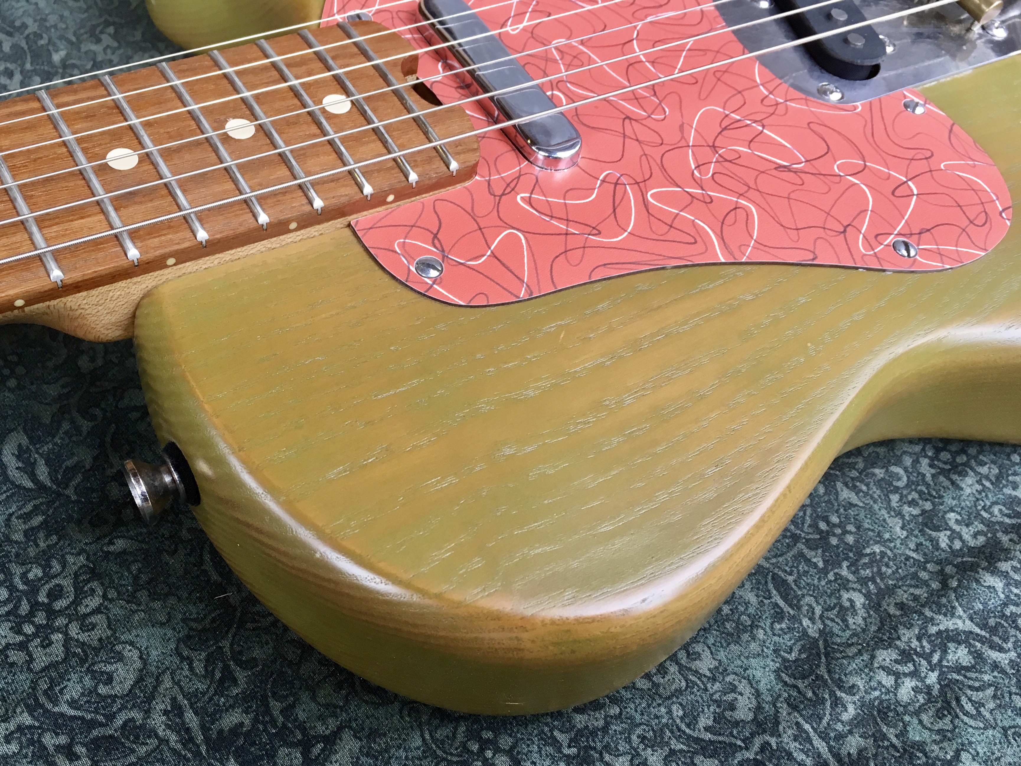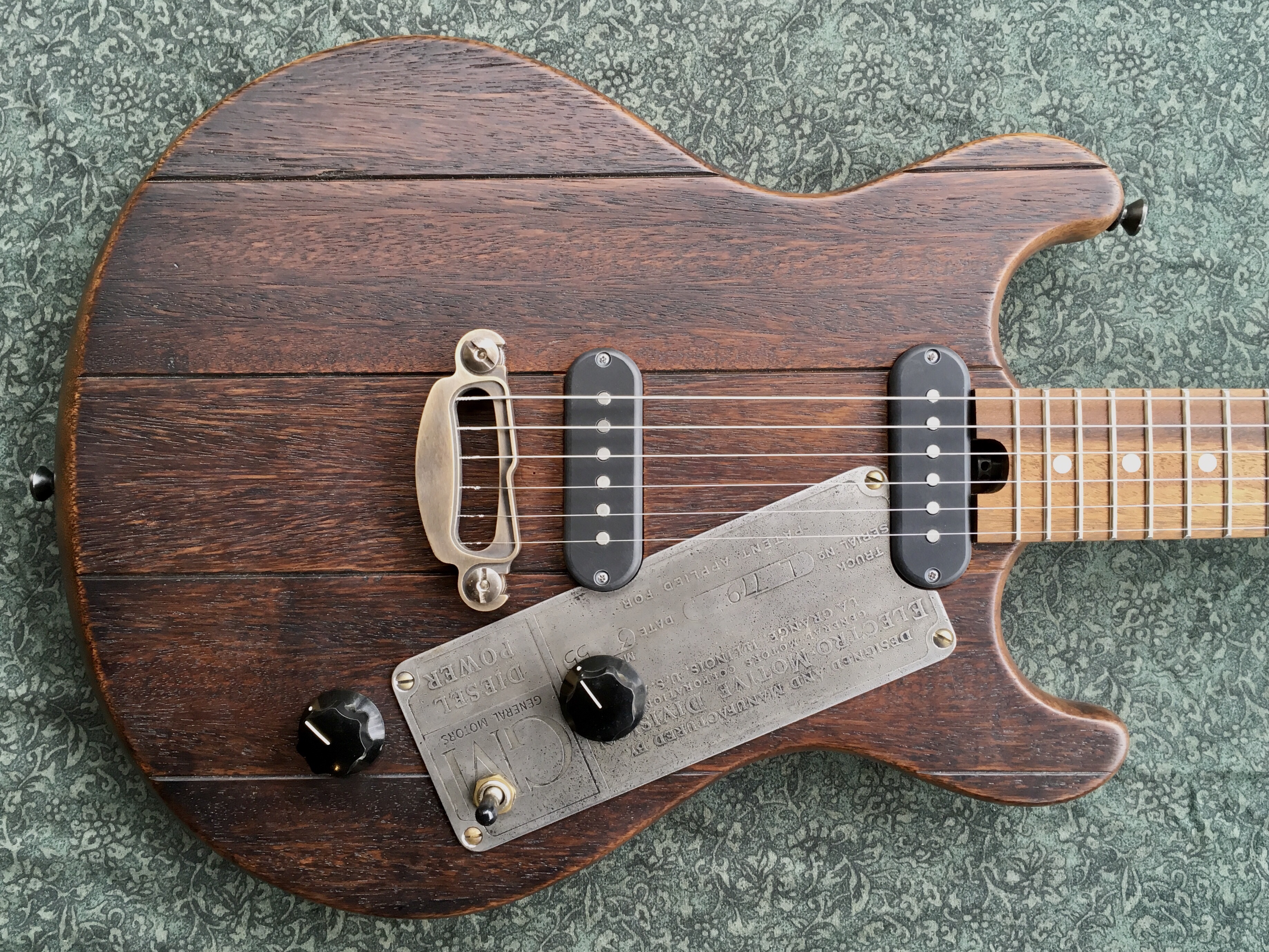 The finish is milk paint, in a color decidedly reminiscent of the “avocado” enamel on many mid-last-century appliances, as inspired by the “Frigidaire” name badge I used as a switch bezel. The pickguard, as well, is cut from a diamond-textured sheet of thin aluminum which looks like it came from the inside of a freezer. The Bigsby B12 tailpiece also resembles a piece of old icebox hardware.