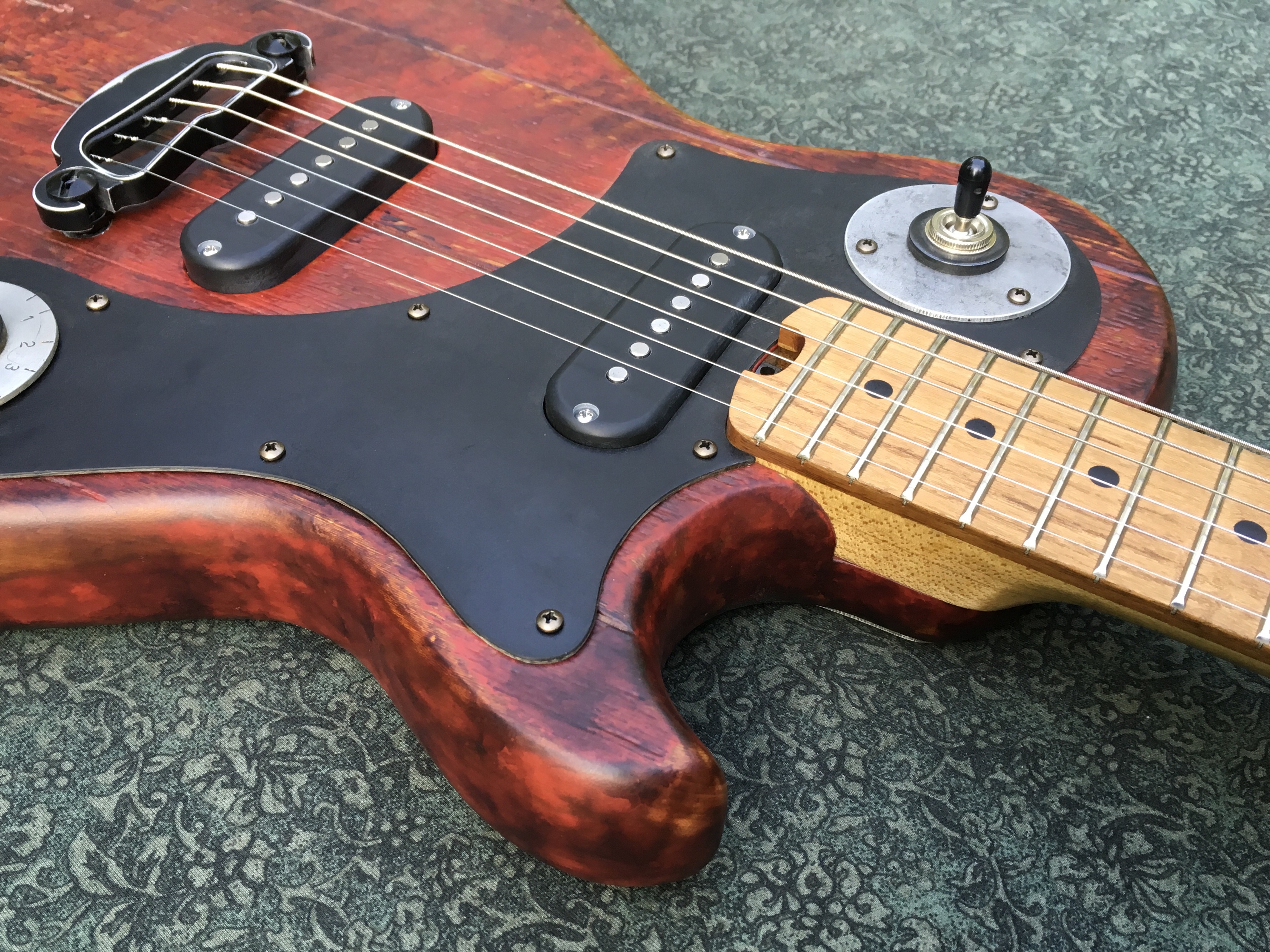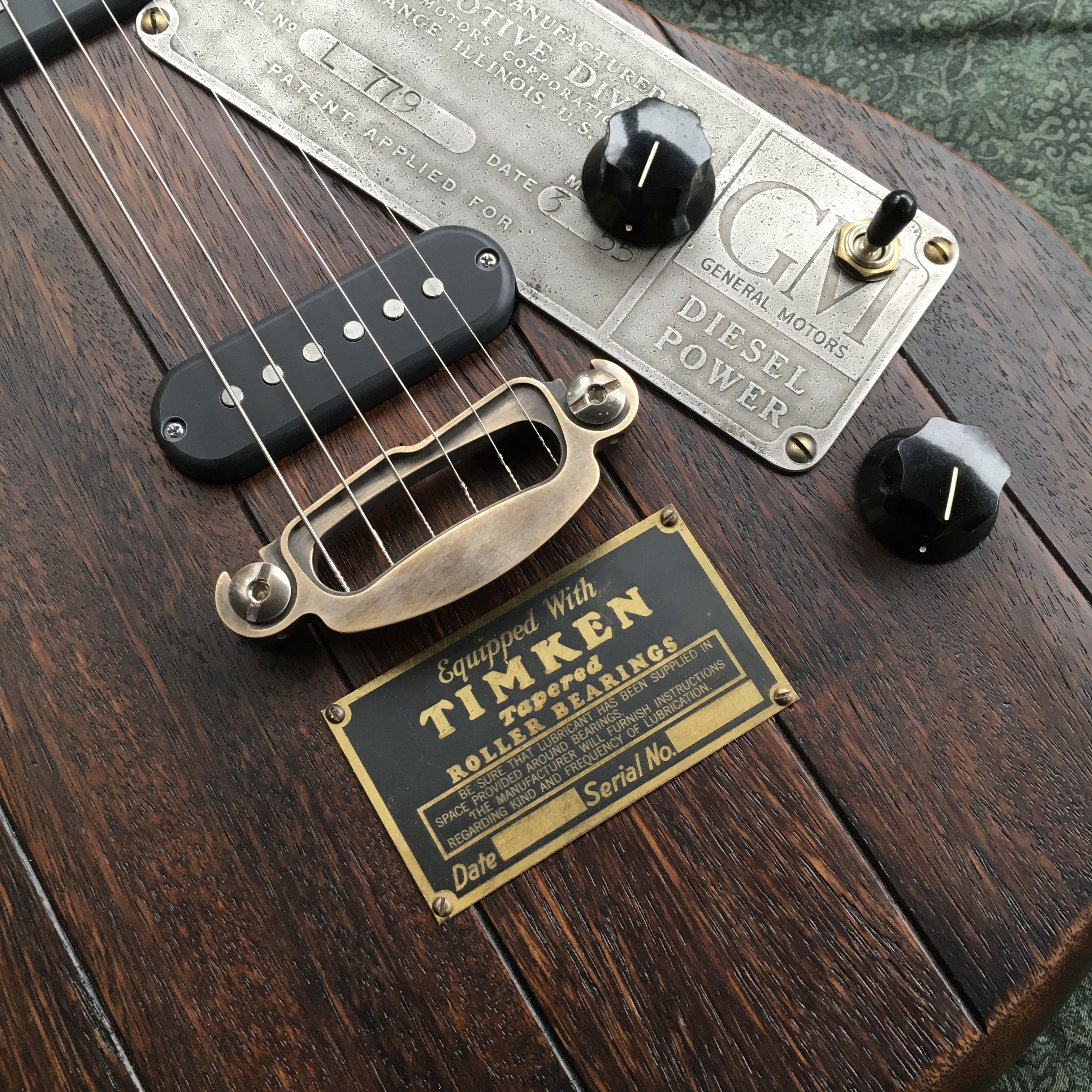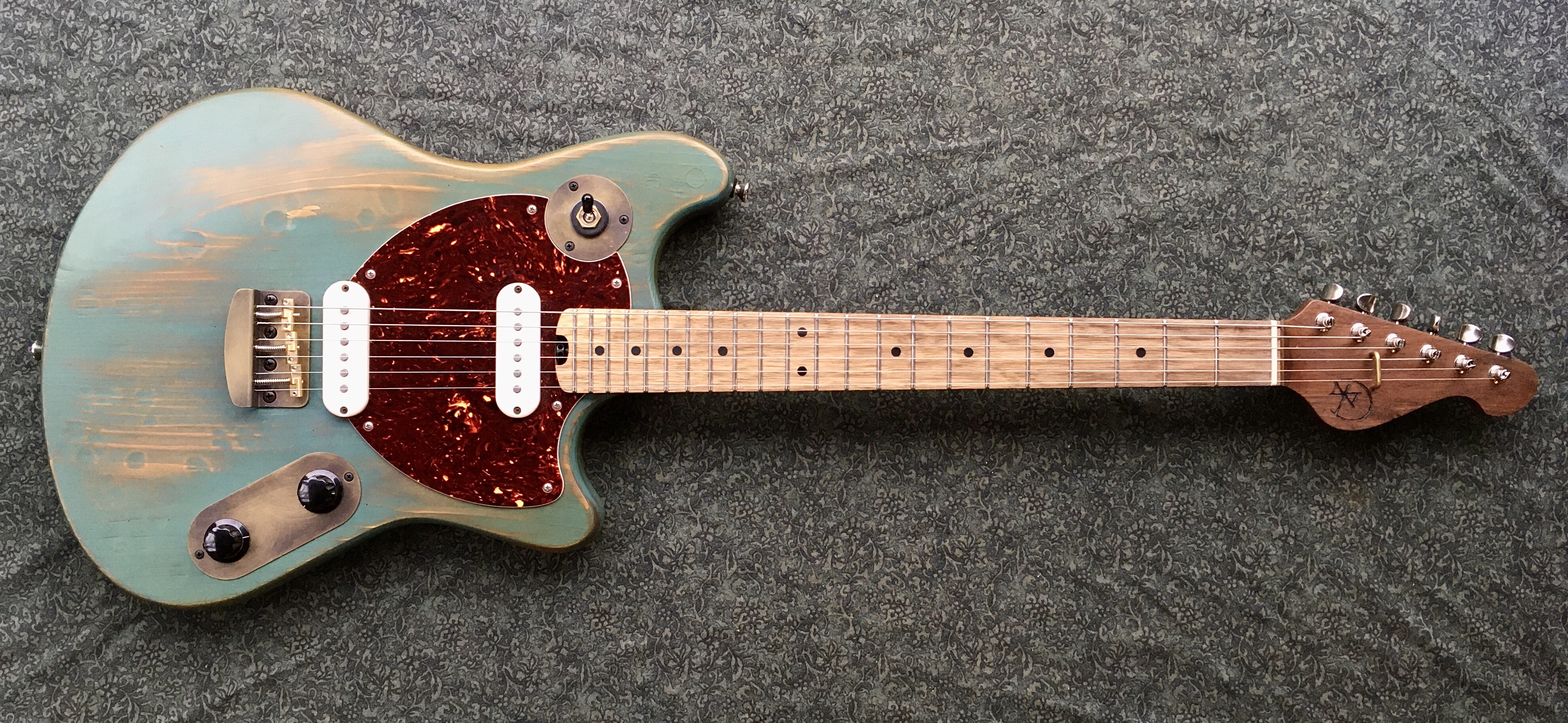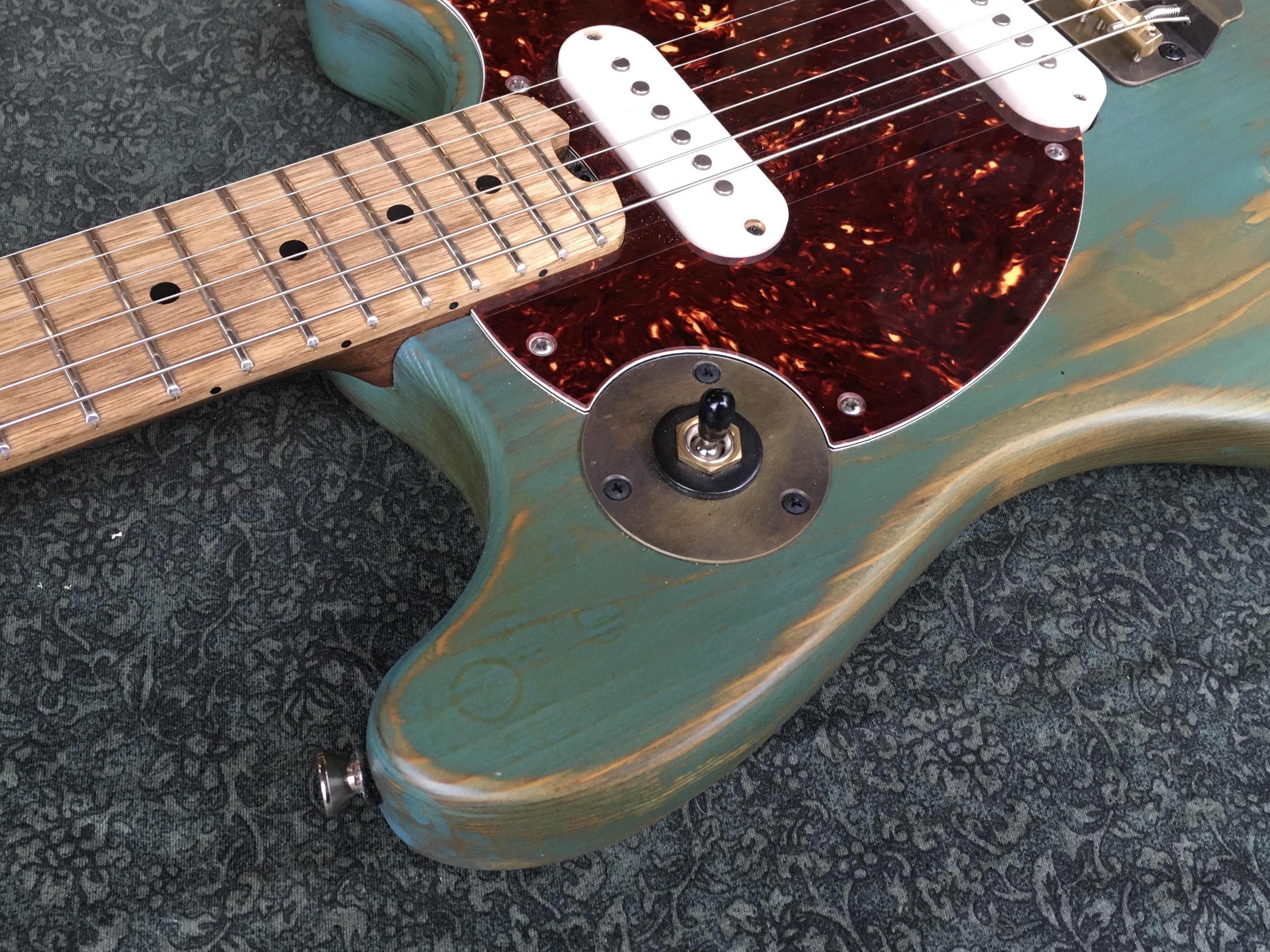 The finish is milk paint, in a color decidedly reminiscent of the “avocado” enamel on many mid-last-century appliances, as inspired by the “Frigidaire” name badge I used as a switch bezel. The pickguard, as well, is cut from a diamond-textured sheet of thin aluminum which looks like it came from the inside of a freezer. The Bigsby B12 tailpiece also resembles a piece of old icebox hardware.