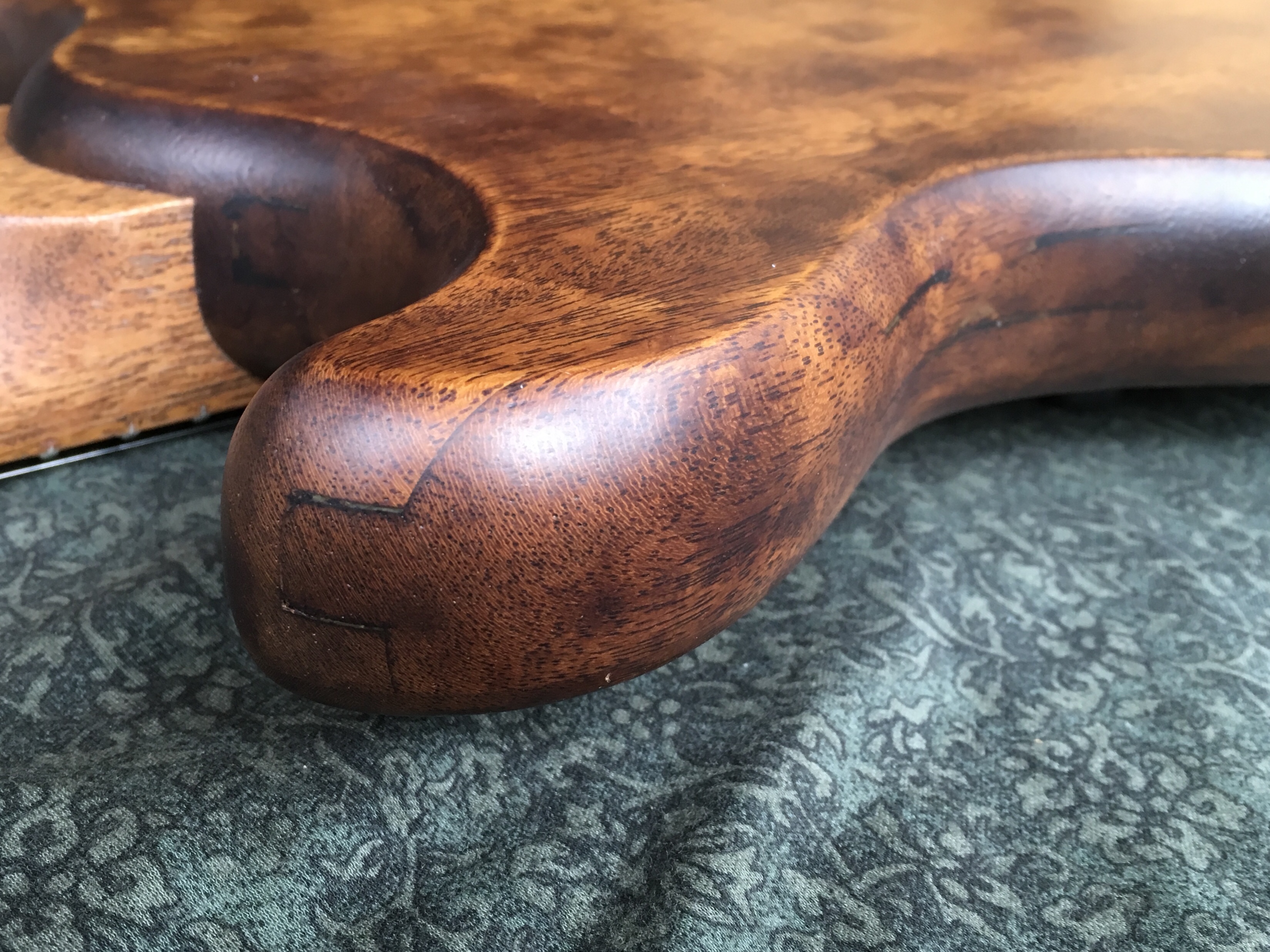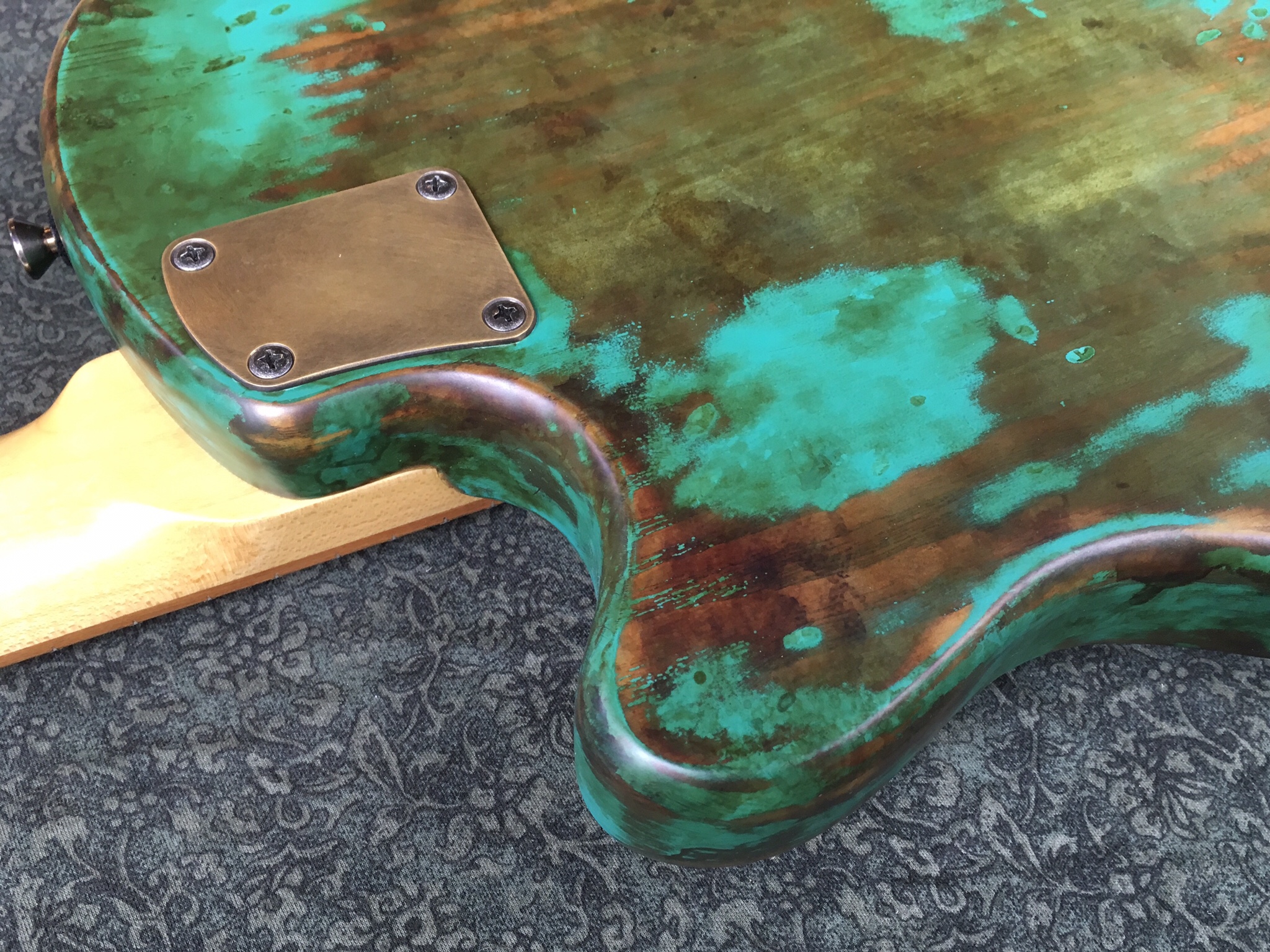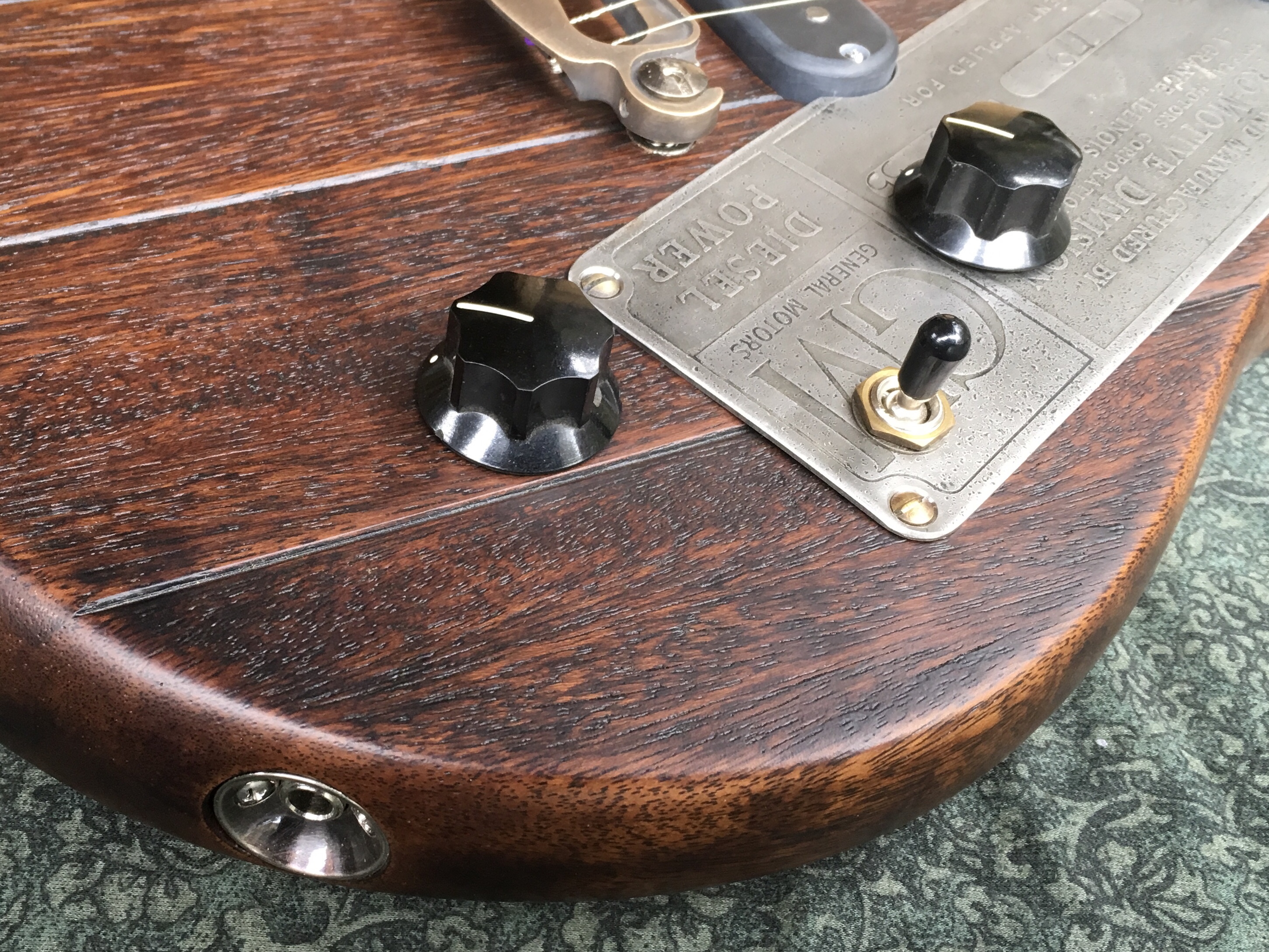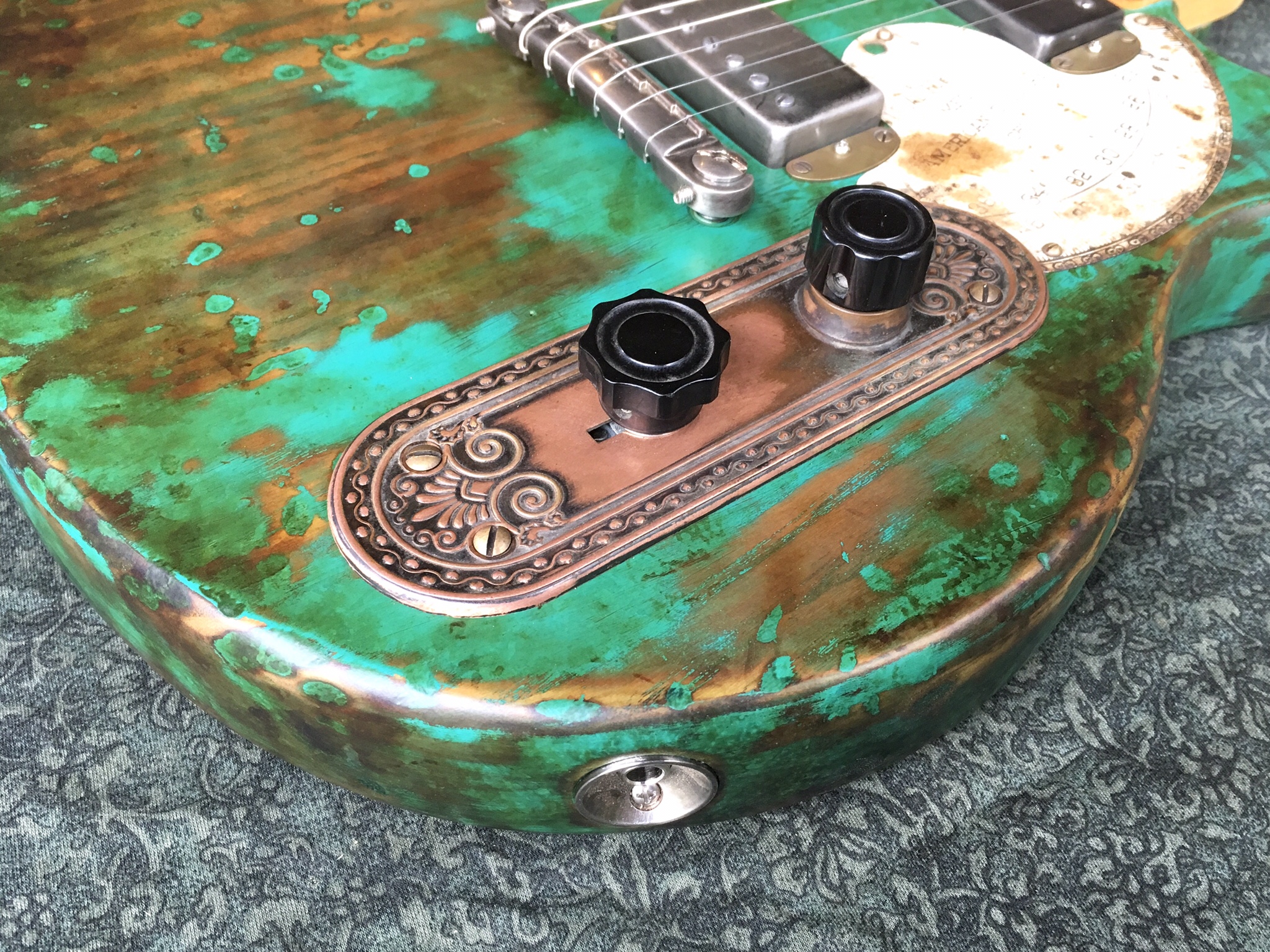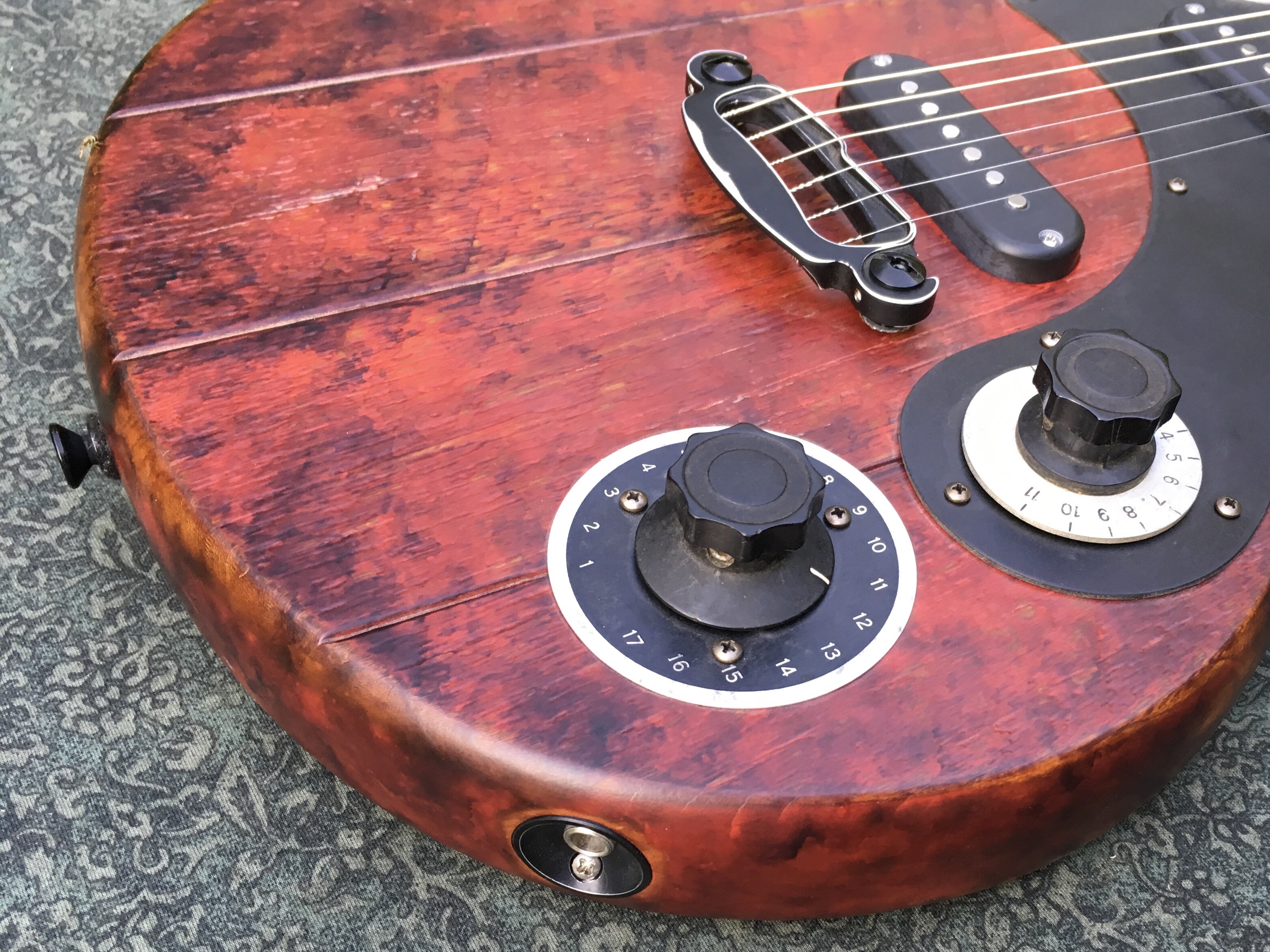 The finish is milk paint, in a color decidedly reminiscent of the “avocado” enamel on many mid-last-century appliances, as inspired by the “Frigidaire” name badge I used as a switch bezel. The pickguard, as well, is cut from a diamond-textured sheet of thin aluminum which looks like it came from the inside of a freezer. The Bigsby B12 tailpiece also resembles a piece of old icebox hardware.