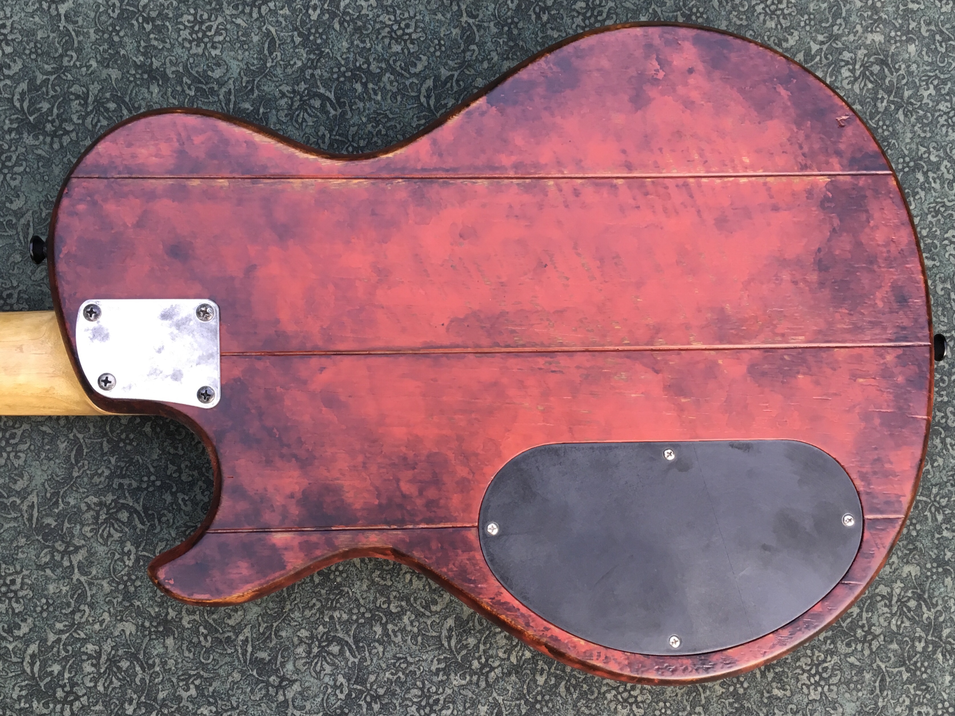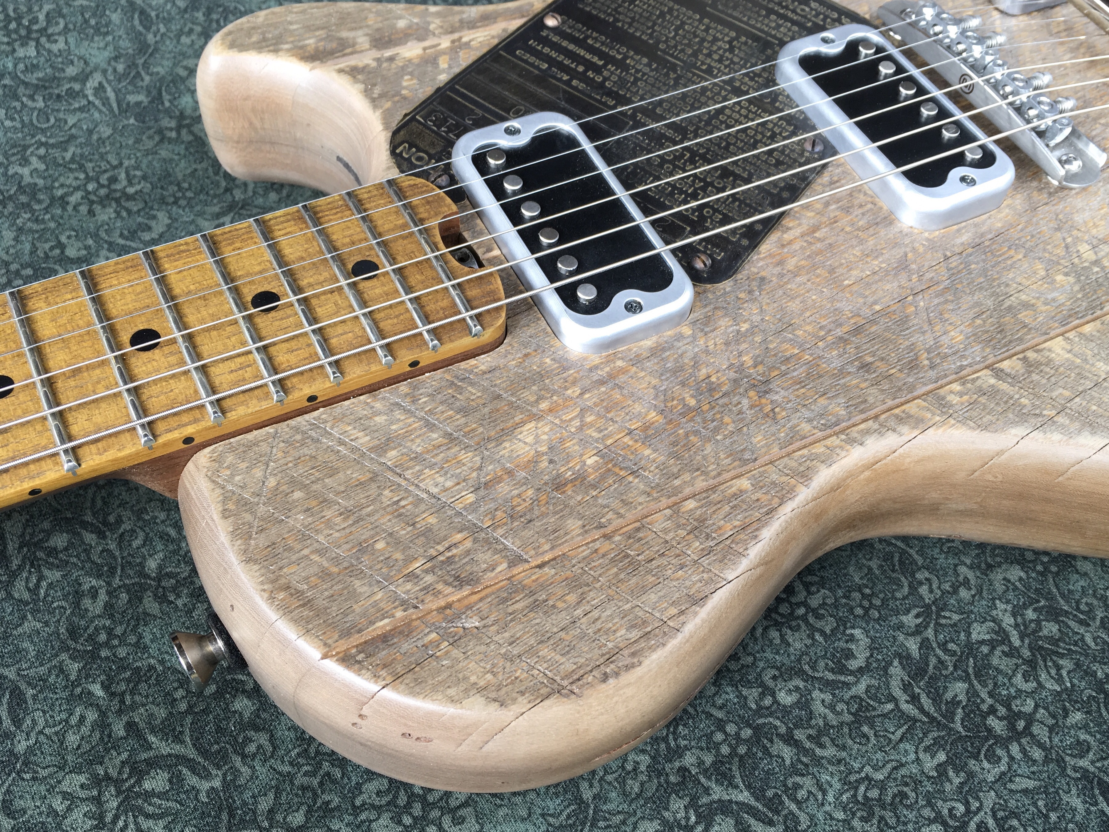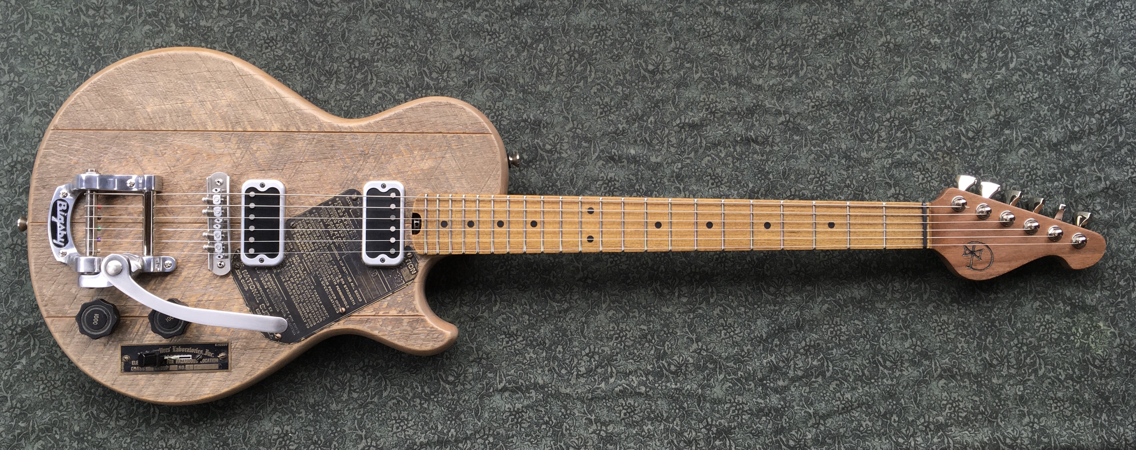 The body is sassafras, with an arched chestnut barnwood top, walnut/maple neck, and black locust fretboard.