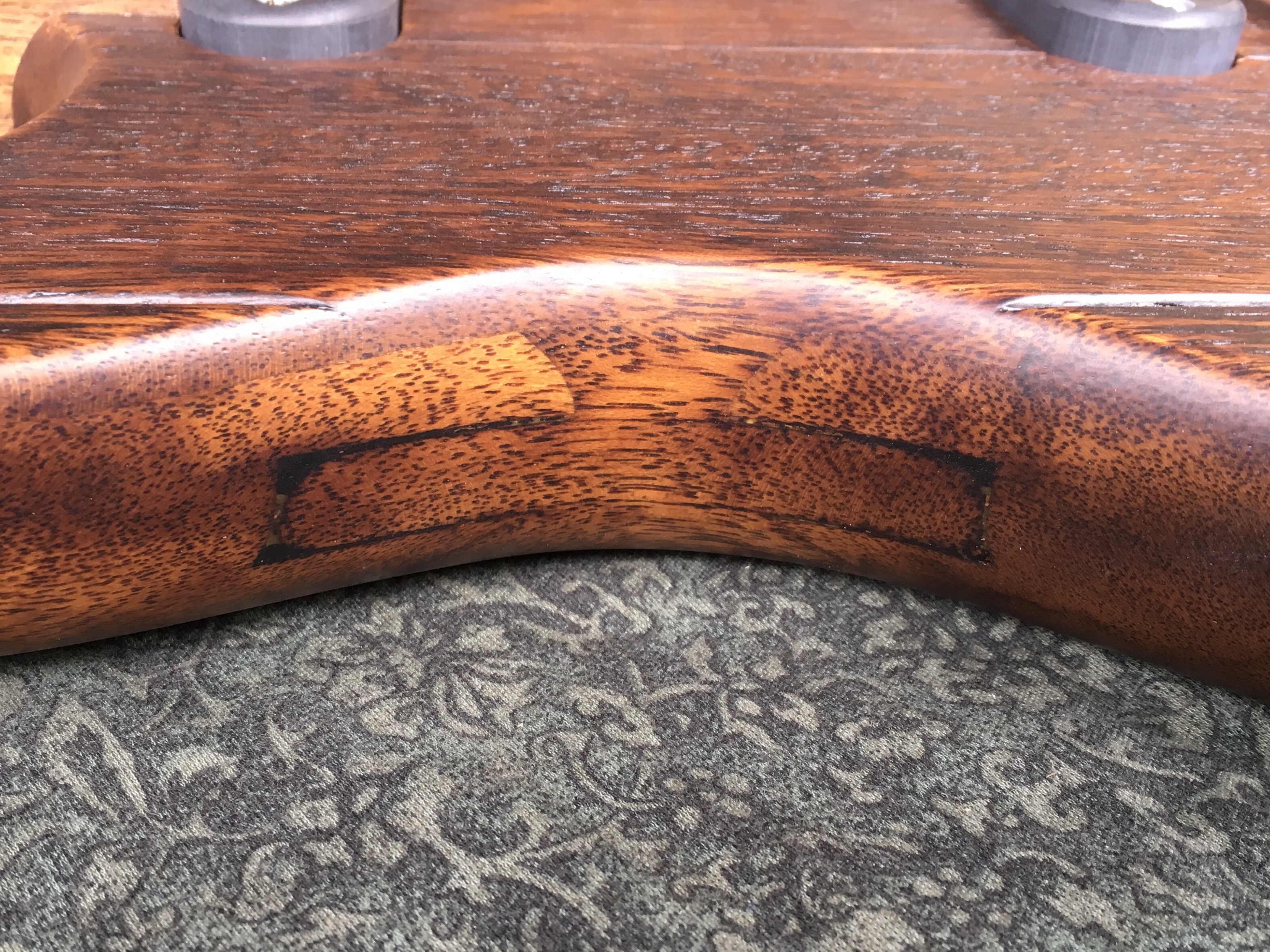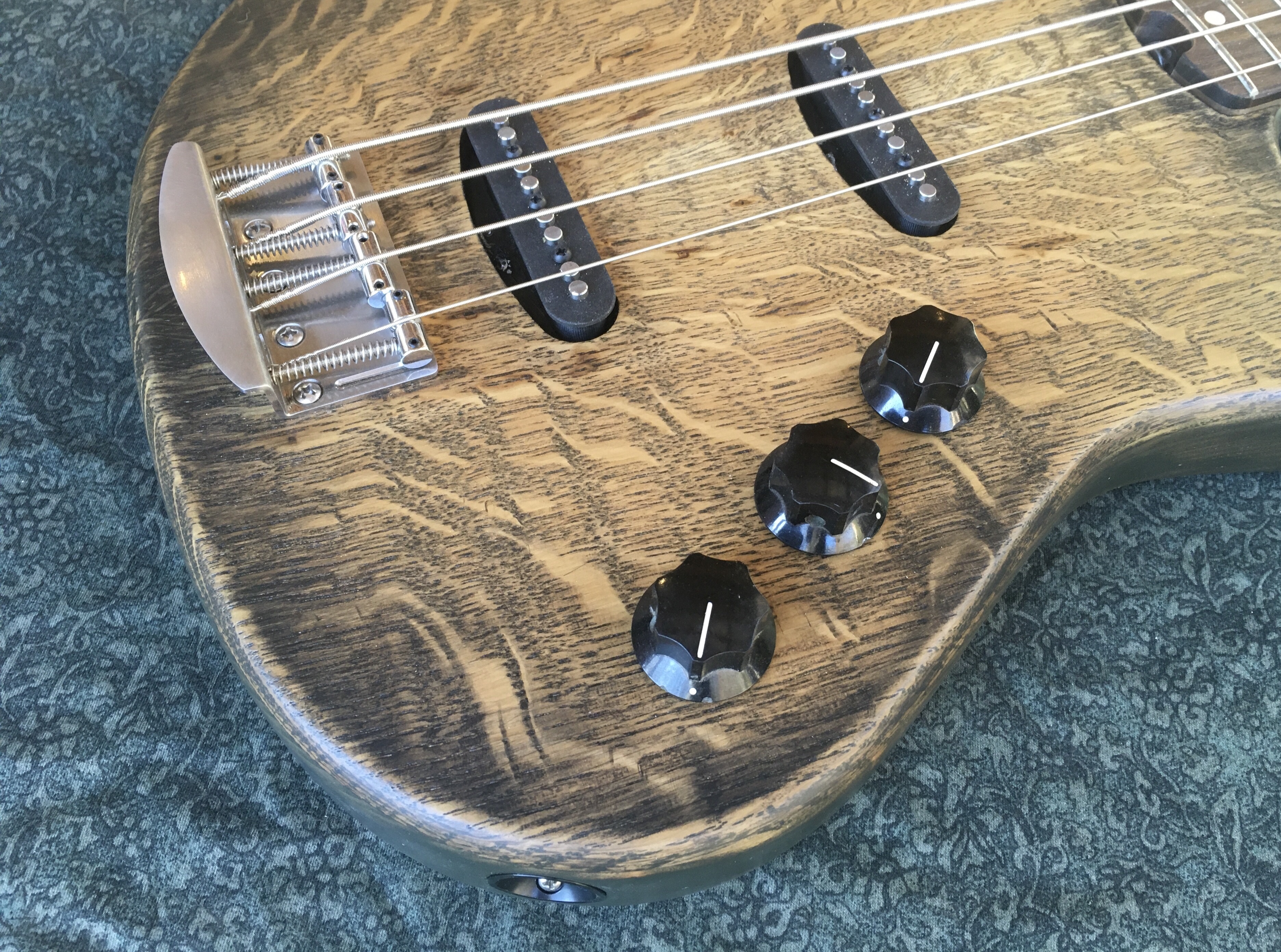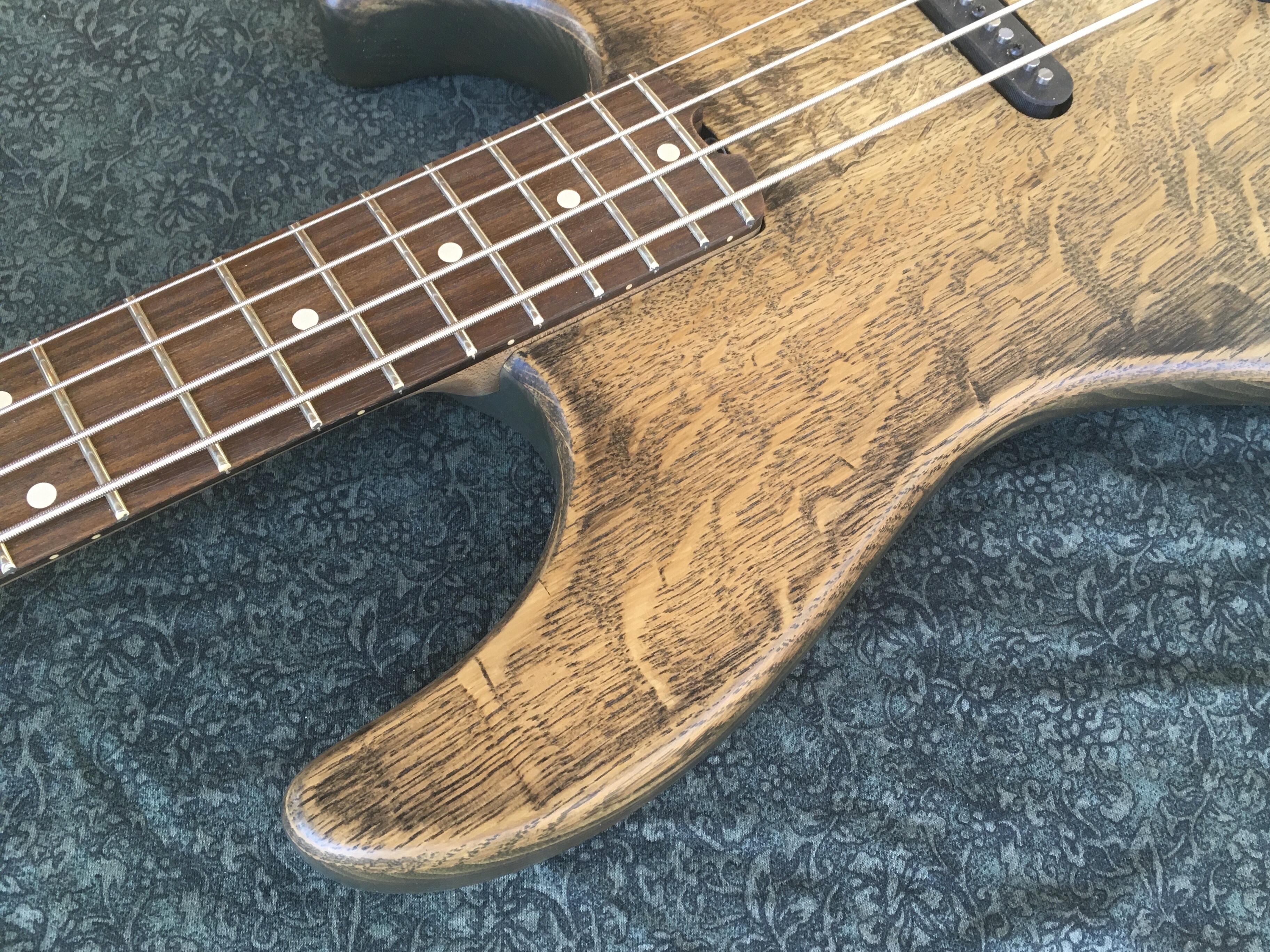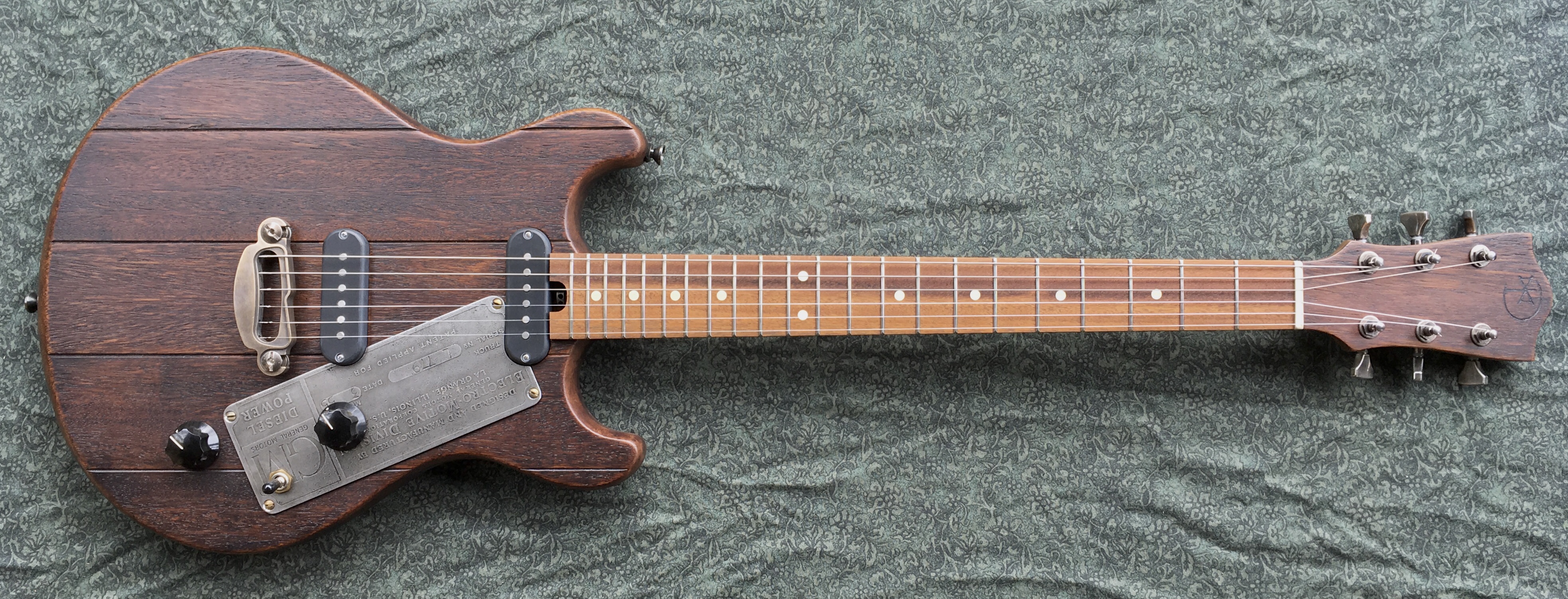 The body is sassafras, with an arched chestnut barnwood top, walnut/maple neck, and black locust fretboard.
