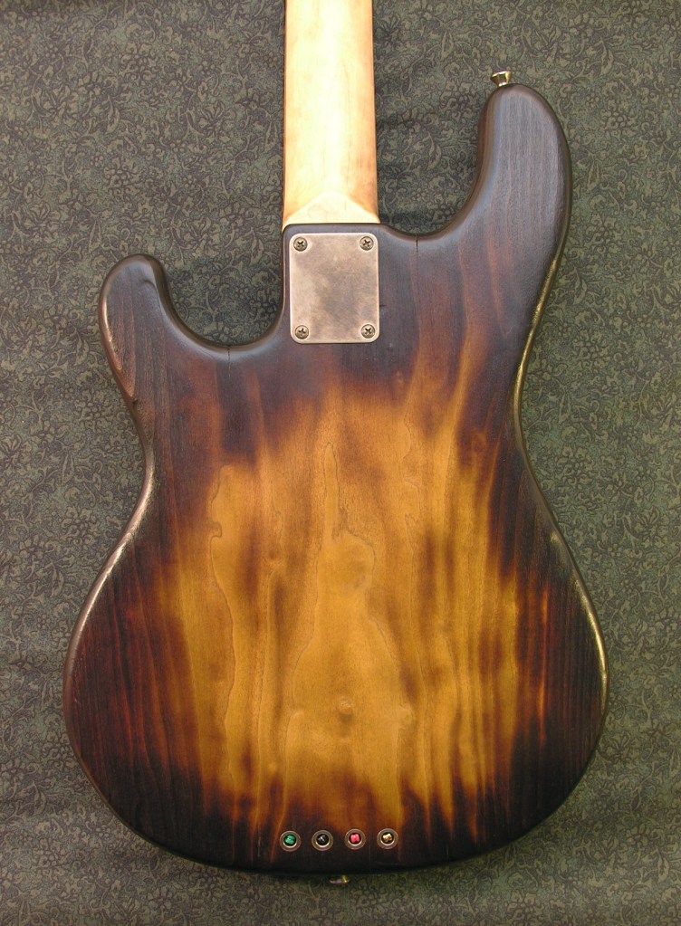Walnut and Osage orange laminated set neck with Osage orange fretboard and oak headstock overlay.