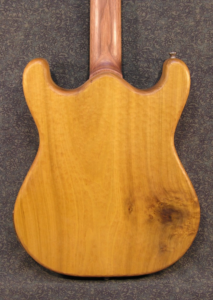 Walnut and cucumbertree laminated set neck with persimmon fretboard.